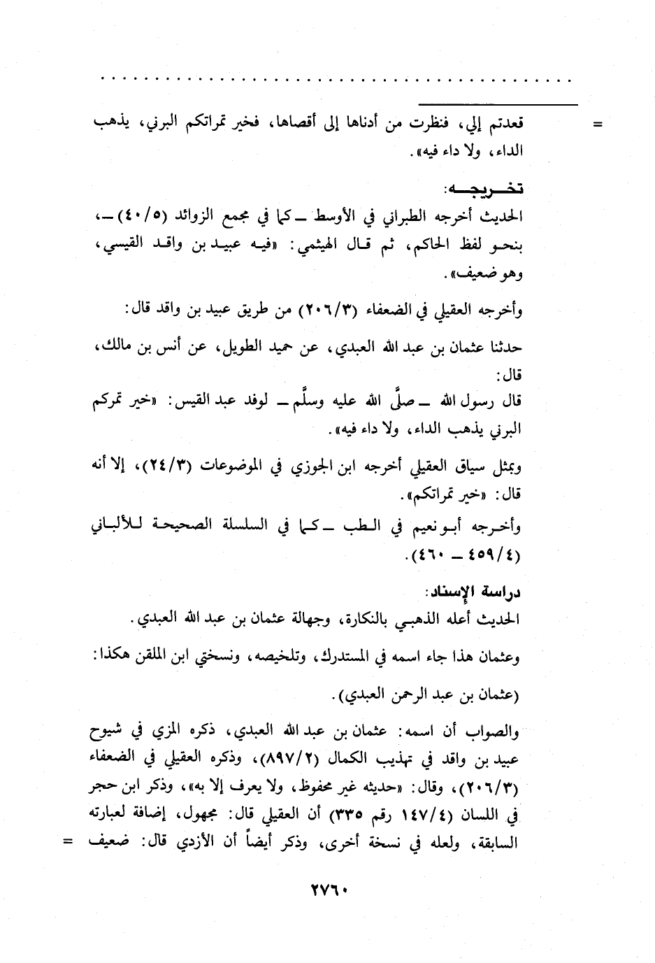 وعثمان هذا جاء اسمه في المستدرك، وتلخيصه، ونسختي ابن الملقن هكذا: (عثمان بن عبد الرحمن العبدي).