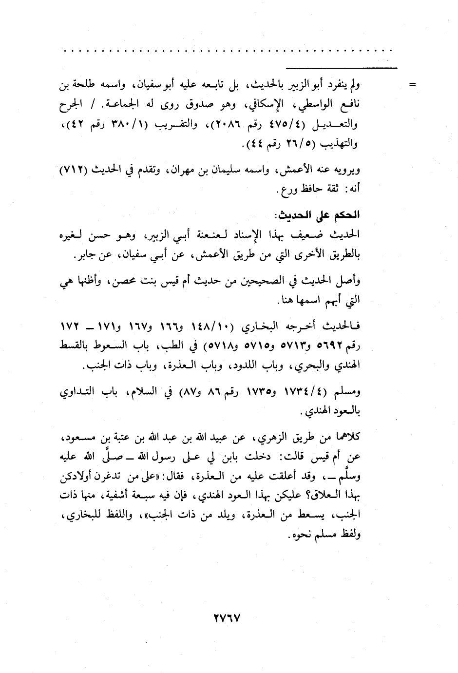 كلاهما من طريق الزهري، عن عبيد الله بن عبد الله بن عتبة بن مسعود، عن أم قيس قالت: دخلت بابن لي على رسول الله -صلى الله عليه وسلم-، وقد أعلقت عليه من العذرة، فقال: "على من تدغرن أولادكن بهذا العلاق؟ عليكن بهذا العود الهندي، فإن فيه سبعة أشفية، منها ذات الجنب، يسعط من العذرة، ويلد من ذات الجنب"، واللفظ للبخاري، ولفظ مسلم نحوه.