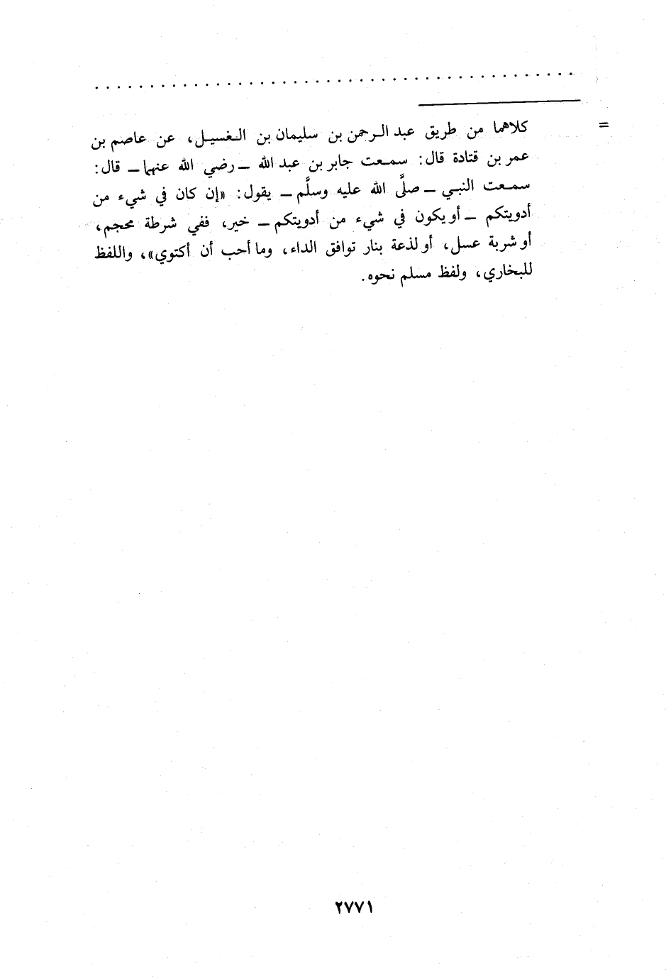 = كلاهما من طريق عبد الرحمن بن سليمان بن الغسيل، عن عاصم بن عمر بن قتادة قال: سمعت جابر بن عبد الله -رضي الله عنهما- قال: سمعت النبي -صلى الله عليه وسلَّم- يقول: "إن كان في شيء من أدويتكم -أو يكون في شيء من أدويتكم- خير، ففي شرطة محجم، أو شربة عسل، أو لذعة بنار توافق الداء، وما أحب أن أكتوي"، واللفظ للبخاري، ولفظ مسلم نحوه.