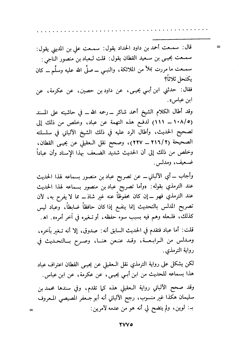 وقد أطال الكلام الشيخ أحمد شاكر -رحمه الله- في حاشيته على المسند (5/ 108 - 111) لدفع هذه التهمة عن عباد، وخلص من ذلك إلى تصحيح الحديث، وأطال الرد عليه في ذلك الشيخ الألباني في سلسلته الصحيحة (2/ 216 - 227)، وصحح نقل العقيلي عن يحيى القطان، وخلص من ذلك إلى أن الحديث شديد الضعف بهذا الِإسناد وأن عباداً ضعيف، ومدلس.