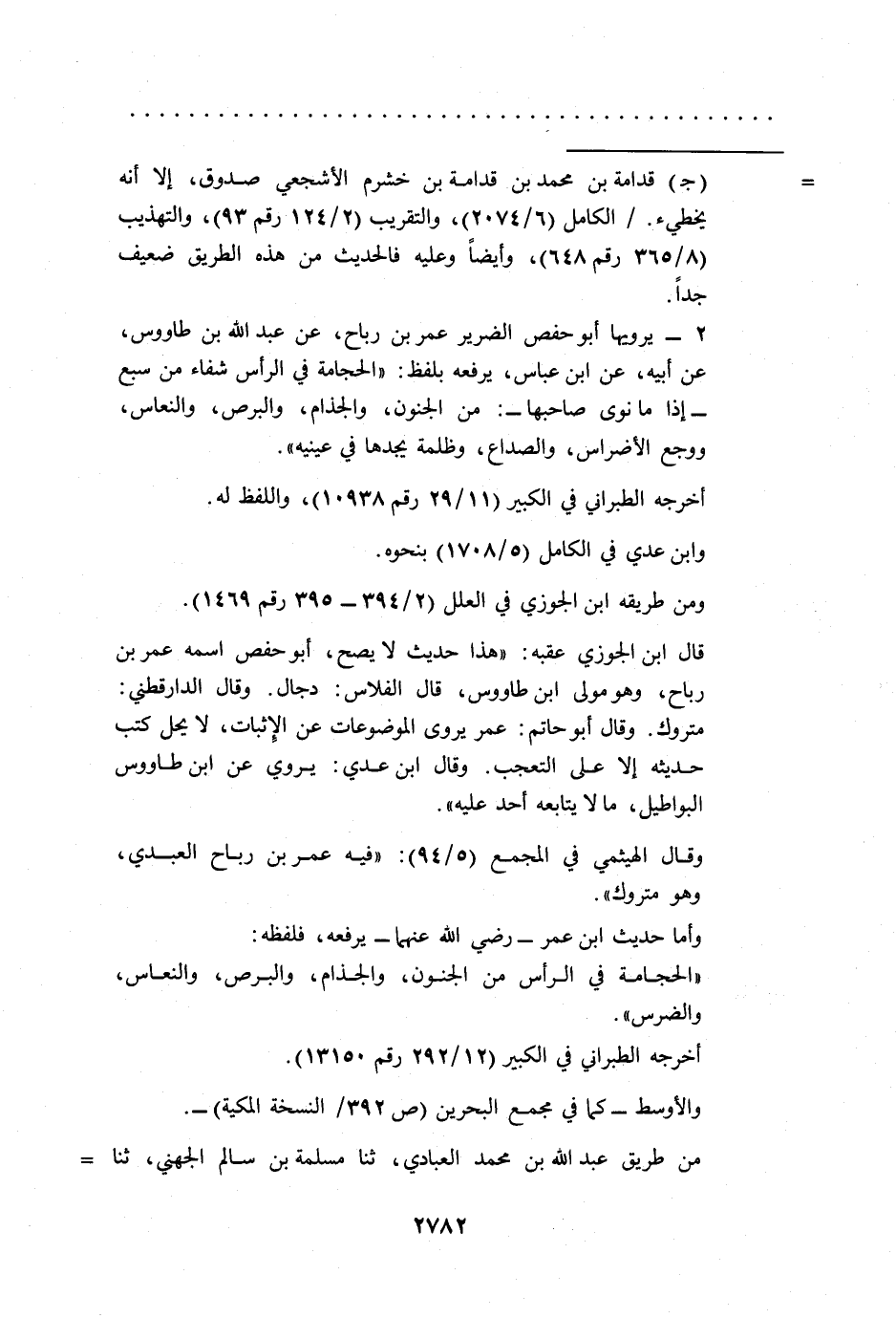 = (ج) قدامة بن محمد بن قدامة بن خشرم الأشجعي صدوق، إلا أنه يخطيء./ الكامل (6/ 2074)، والتقريب (2/ 124 رقم 93)، والتهذيب (8/ 365رقم 648)، وأيضاً وعليه فالحديث من هذه الطريق ضعيف جداً.