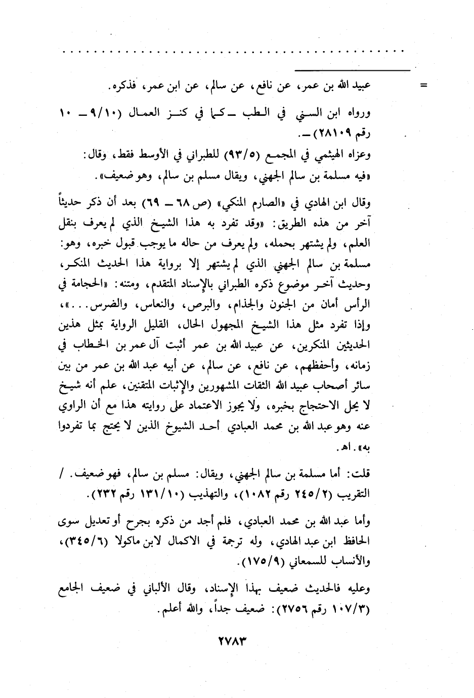 وقال ابن الهادي في الصارم المنكي" (ص 68 - 69) بعد أن ذكر حديثاً آخر من هذه الطريق: "وقد تفرد به هذا الشيخ الذي لم يعرف بنقل العلم، ولم يشتهر بحمله، ولم يعرف من حاله ما يوجب قبول خبره، وهو: مسلمة بن سالم الجهني. الذي لم يشتهر إلا برواية هذا الحديث المنكر، وحديث آخر موضوع ذكره الطبراني بالِإسناد المتقدم، ومتنه: "الحجامة في الرأس أمان من الجنون والجذام، والبرص، والنعاس، والضرس ... "، وإذا تفرد مثل هذا الشيخ المجهول الحال، القليل الرواية بمثل هذين الحديثين المنكرين، عن عبيد الله بن عمر أثبت آل عمر بن الخطاب في زمانه، وأحفظهم، عن نافع، عن سالم، عن أبيه عبد الله بن عمر من بين سائر أصحاب عبيد الله الثقات المشهورين والِإثبات المتقنين، علم أنه شيخ لا يحل الاحتجاج بخبره، ولا يجوز الاعتماد على روايته هذا مع أن الراوي عنه وهو عبد الله بن محمد العبادي أحد الشيوخ الذين لا يحتج بما تفردوا به". اهـ.