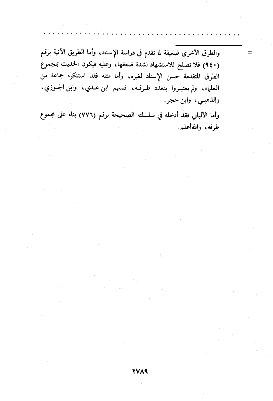 = والطرق الأخرى ضعيفة لما تقدم في دراسة الإِسناد، وأما الطريق الآتية برقم (940) فلا تصلح للاستشهاد لشدة ضعفها، وعليه فيكون الحديث بمجموع الطرق المتقدمة حسن الِإسناد لغيره، وأما متنه فقد استنكره جماعة من العلماء، ولم يعتبروا بتعدد طرقه، فمنهم ابن عدي، وابن الجوزي، والذهبي، وابن حجر.