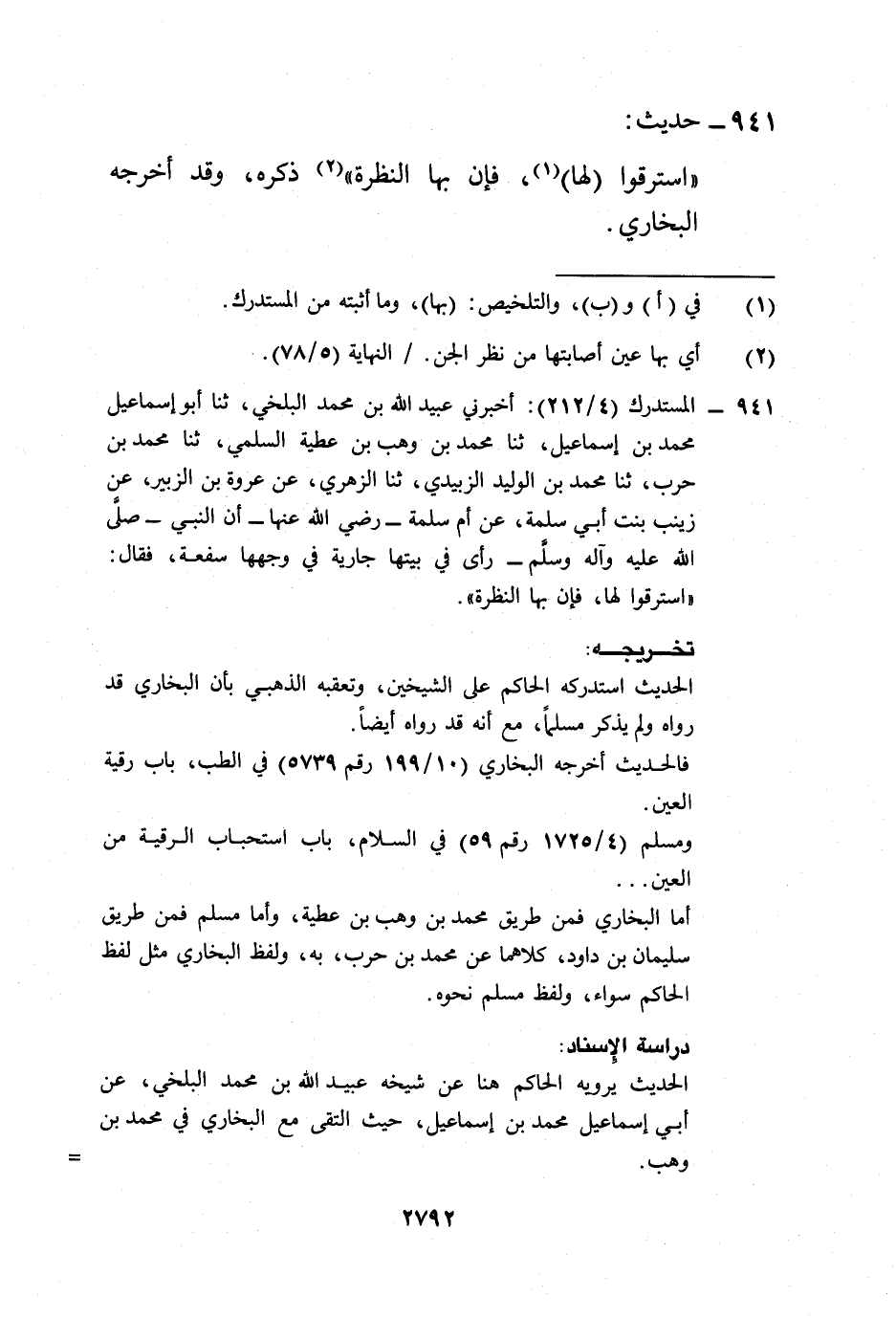 941 - المستدرك (4/ 212): أخبرني عبيد الله بن محمد البلخي، ثنا أبو إسماعيل محمد بن إسماعيل، ثنا محمد بن وهب بن عطية السلمي، ثنا محمد بن حرب، ثنا محمد بن الوليد الزبيدي، ثنا الزهري، عن عروة بن الزبير، عن زينب بنت أبي سلمة، عن أم سلمة -رضي الله عنها- أن النبي -صلى الله عليه وآله وسلم- رأى في بيتها جارية في وجهها سفعة، فقال: "استرقوا لها، فإن بها النظرة".