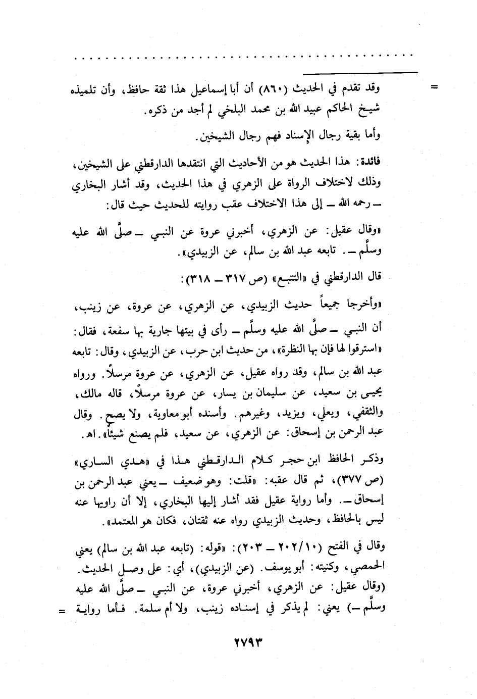وذكر الحافظ ابن حجر كلام الدارقطني هذا في "هدي الساري" (ص 377)، ثم قال عقبه: "قلت: وهو ضعيف -يعني عبد الرحمن بن إسحاق-. وأما رواية عقيل فقد أشار إليها البخاري، إلا أن راويها عنه ليس بالحافظ، وحديث الزبيدي رواه عنه ثقتان، فكان هو المعتمد".