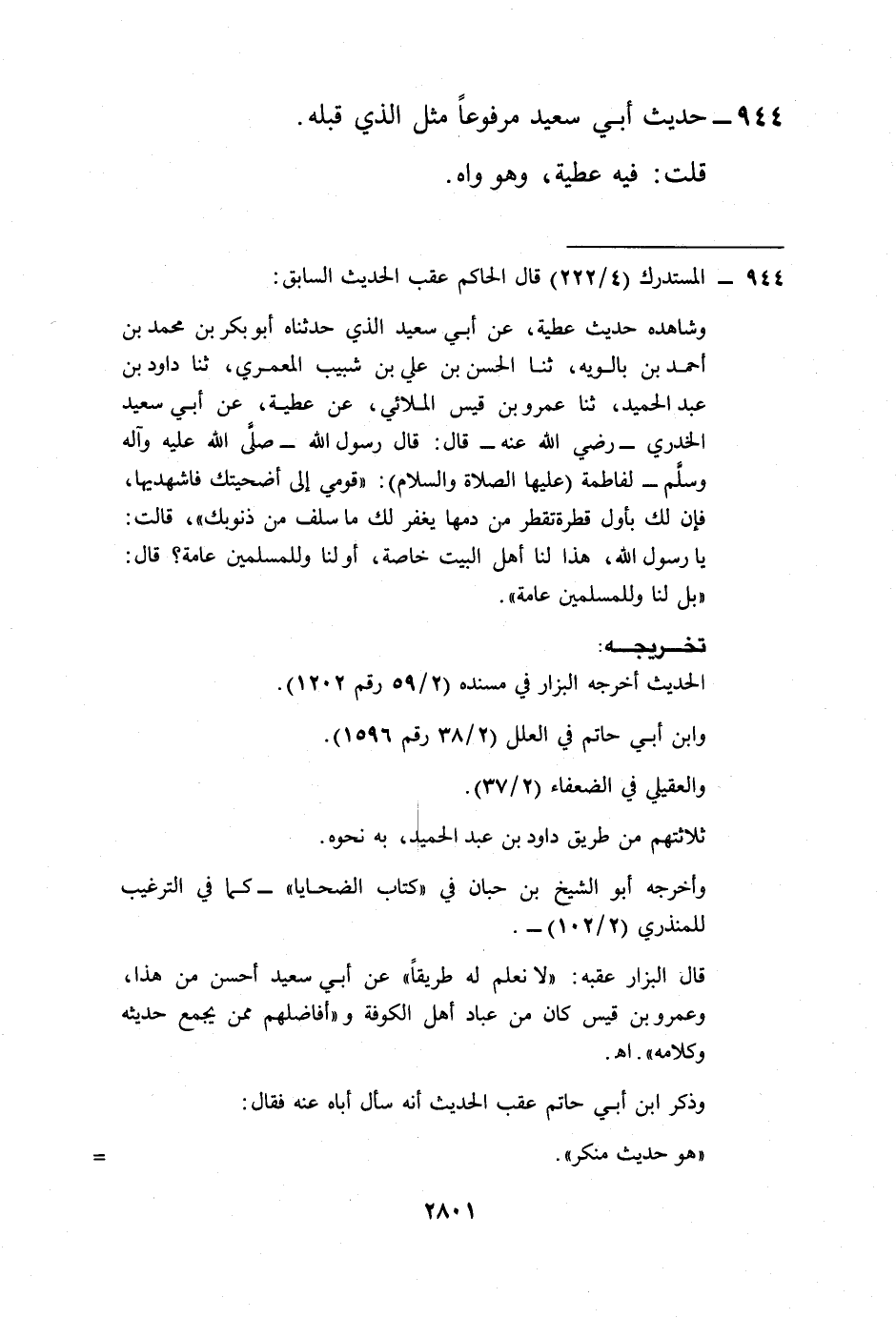وشاهده حديث عطية، عن أبي سعيد الذي حدثناه أبو بكر بن محمد بن أحمد بن بالويه، ثنا الحسن بن علي بن شبيب المعمري، ثنا داود بن عبد الحميد، ثنا عمرو بن قيس الملائي، عن عطية، عن أبي سعيد الخدري -رضي الله عنه- قال: قال رسول الله -صلى الله عليه وآله وسلم- لفاطمة (عليها الصلاة والسلام): "قومي إلى أضحيتك فاشهديها، فإن لك بأول قطرة تقطر من دمها يغفر لك ما سلف من ذنوبك"، قالت: يا رسول الله، هذا لنا أهل البيت خاصة، أو لنا وللمسلمين عامة؟ قال: "بل لنا وللمسلمين عامة".