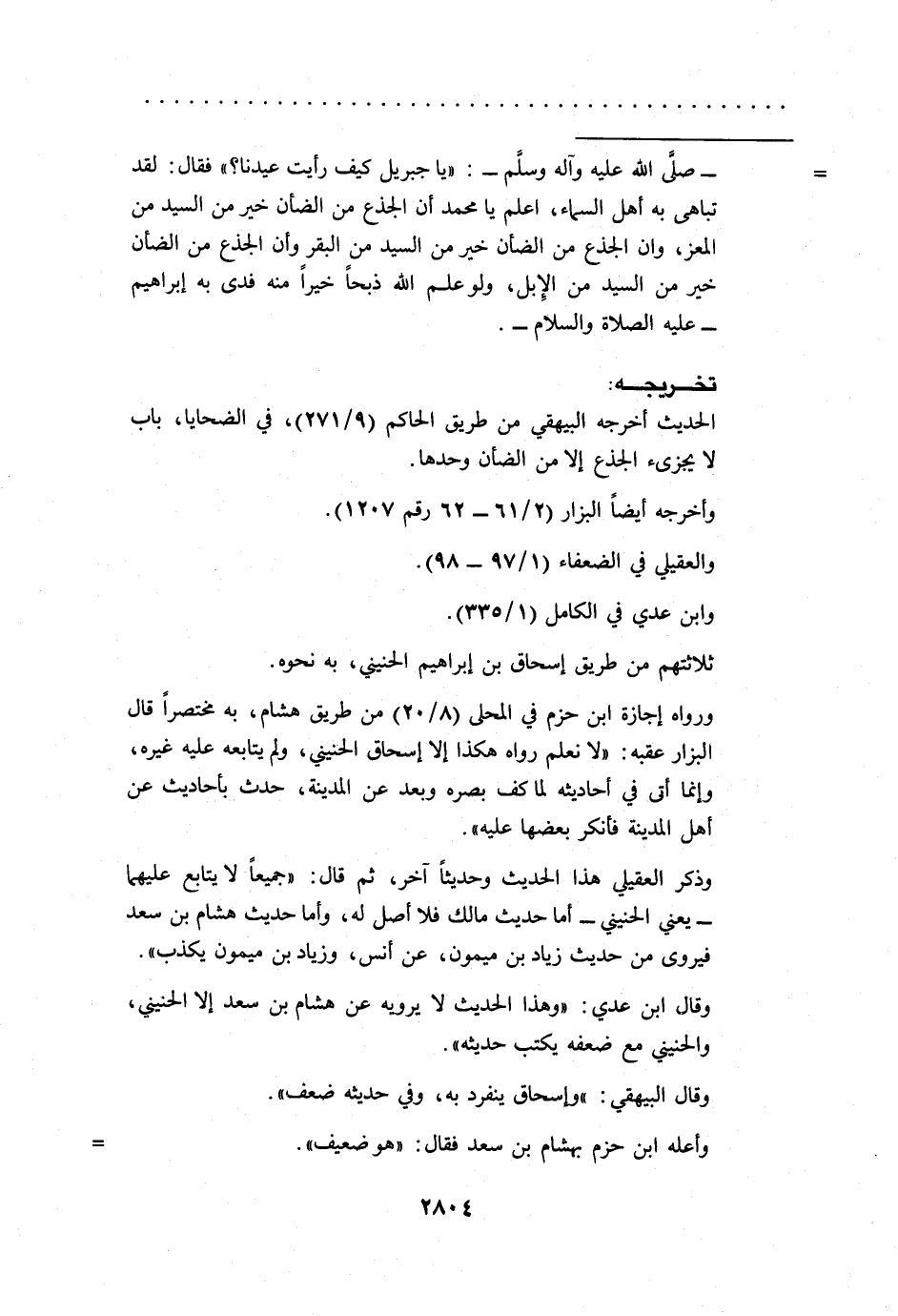 = -صلى الله عليه وآله وسلم-: "يا جبريل كيف رأيت عيدنا؟ " فقال: لقد تباهى به أهل السماء، اعلم يا محمد أن الجذع من الضأن خير من السيد من المعز، وأن الجذع من الضأن خير من السيد من البقر وأن الجذع من الضأن خير من السيد من الِإبل، ولوعلم الله ذبحاً خيراً منه فدى به إبراهيم -عليه الصلاة والسلام-.
