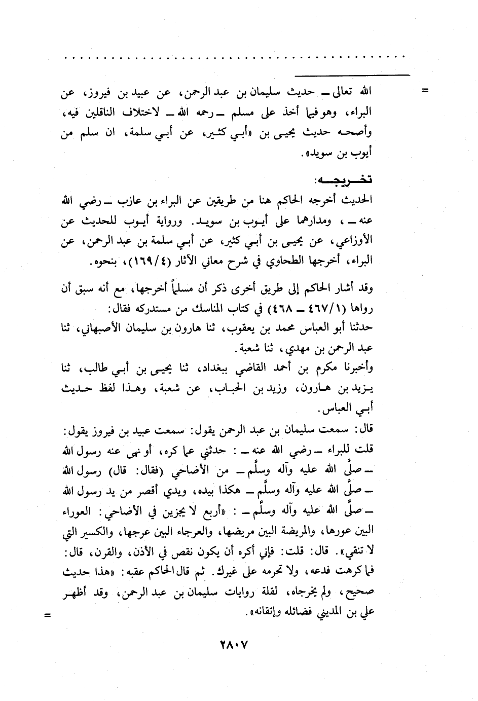 = الله تعالى- حديث سليمان بن عبد الرحمن، عن عبيد بن فيروز، عن البراء، وهو فيما أخذ على مسلم -رحمه الله- لاختلاف الناقلين فيه، وأصحه حديث يحيى بن "أبي كثير، عن أبي سلمة، أن سلم من أيوب بن سويد".