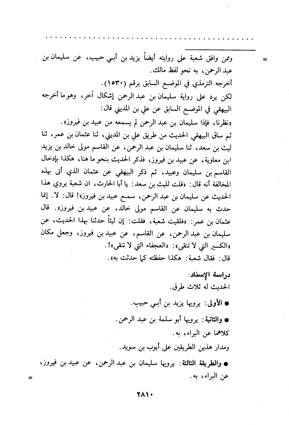 ثم ساق البيهقي الحديث من طريق علي بن المديني، ثنا عثمان بن عمر، ثنا ليث بن سعد، ثنا سليمان بن عبد الرحمن، عن القاسم مولى خالد بن يزيد ابن معاوية، عن عبيد بن فيروز، فذكر الحديث بنحو ما هنا، هكذا بإدخال القاسم بن سليمان وعبيد، ثم ذكر البيهقي عن عثمان الذي أتى بهذه المخالفة أنه قال: "قلت لليث بن سعد: يا أبا الحارث، أن شعبة يروي هذا الحديث عن سليمان بن عبد الرحمن، سمع عبيد بن فيروز"! قال: لا. إنما حدث به سليمان عن القاسم مولى خالد، عن عبيد بن فيروز". قال عثمان بن عمر: "فلقيت شعبة، فقلت: إن ليثاً حدثنا بهذا الحديث، عن سليمان بن عبد الرحمن، عن القاسم، عن عبيد بن فيروز، وجعل مكان "الكسير التي لا تنقى": "العجفاء التي لا تنقى"!.