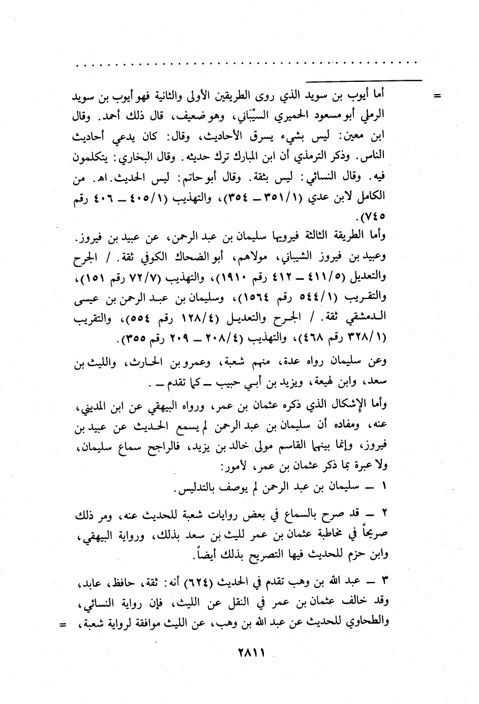 = أما أيوب بن سويد الذي روى الطريقين الأولى والثانية فهو أيوب بن سويد الرملي أبو مسعود الحميري السيْبَاني، وهو ضعيف، قال ذلك أحمد. وقال ابن معين: ليس بشيء يسرق الأحاديث، وقال: كان يدعي أحاديث الناس. وذكر الترمذي أن ابن المبارك ترك حديثه. وقال البخاري: يتكلمون فيه. وقال النسائي: ليس بثقة. وقال أبو حاتم: ليس الحديث. اهـ. من الكامل لابن عدي (1/ 351 - 354)، والتهذيب (1/ 405 - 406 رقم 745).