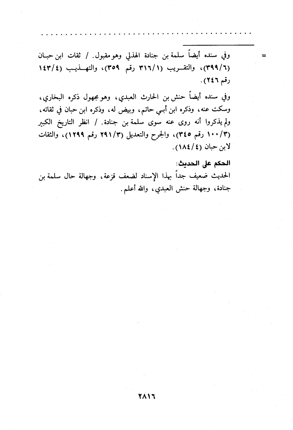 وفي سنده أيضاً حنش بن الحارث العبدي، وهو مجهول ذكره البخاري، وسكت عنه، وذكره ابن أبي حاتم، وبيض له، وذكره ابن حبان في ثقاته، ولم يذكروا أنه روى عنه سوى سلمة بن جنادة./ انظر التاريخ الكبير (3/ 100رقم 345)، والجرح والتعديل (3/ 291 رقم 1299)، والثقات لابن حبان (4/ 184).