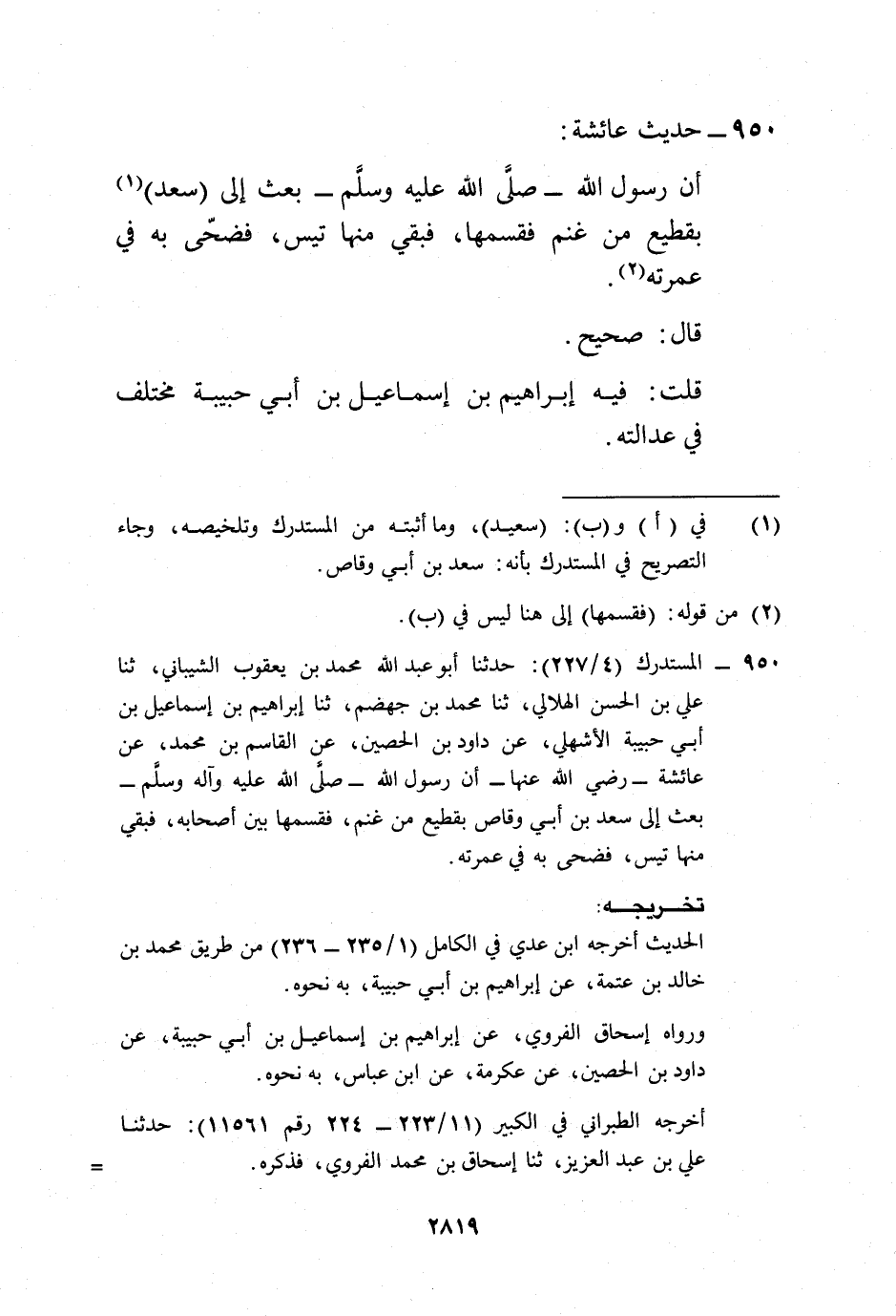 950 - المستدرك (4/ 227): حدثنا أبو عبد الله محمد بن يعقوب الشيباني، ثنا علي بن الحسن الهلالي، ثنا محمد بن جهضم، ثنا إبراهيم بن إسماعيل بن أبي حبيبة الأشهلي، عن داود بن الحصين، عن القاسم بن محمد، عن عائشة -رضي الله عنها- أن رسول الله -صلى الله عليه وآله وسلم- بعث إلى سعد بن أبي وقاص بقطيع من غنم، فقسمها بين أصحابه، فبقي منها تيس، فضحى به في عمرته.