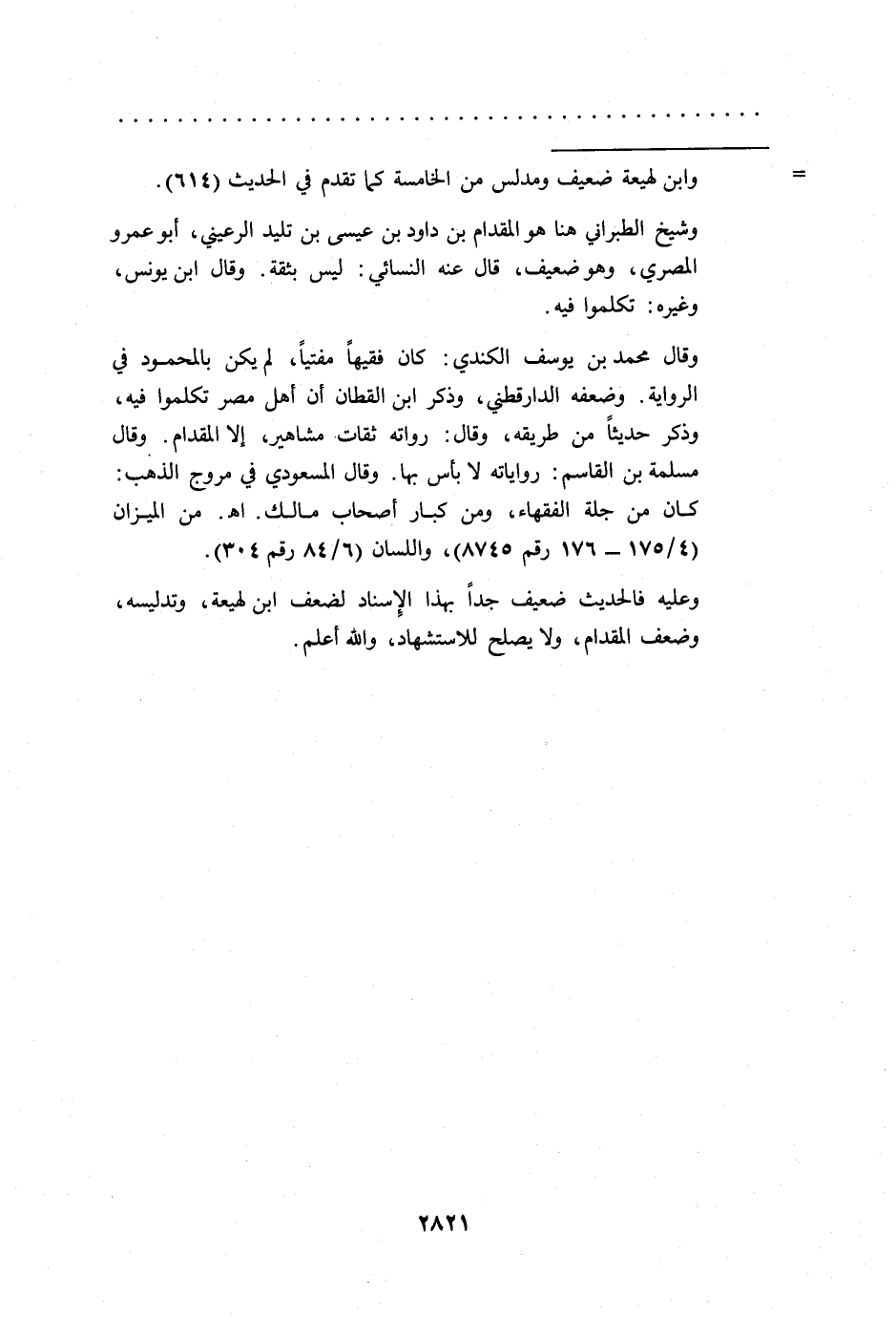 وقال محمد بن يوسف الكندي: كان فقيهاً مفتياً، لم يكن بالمحمود في الرواية. وضعفه الدارقطني، وذكر ابن القطان أن أهل مصر تكلموا فيه، وذكر حديثاً من طريقه، وقال: رواته ثقات مشاهير، إلا المقدام. وقال مسلمة بن القاسم: رواياته لا بأس بها. وقال المسعودي في مروج الذهب: كان من جلة الفقهاء، ومن كبار أصحاب مالك. اهـ. من الميزان (4/ 175 - 176 رقم 8745)، واللسان (6/ 84رقم 304).