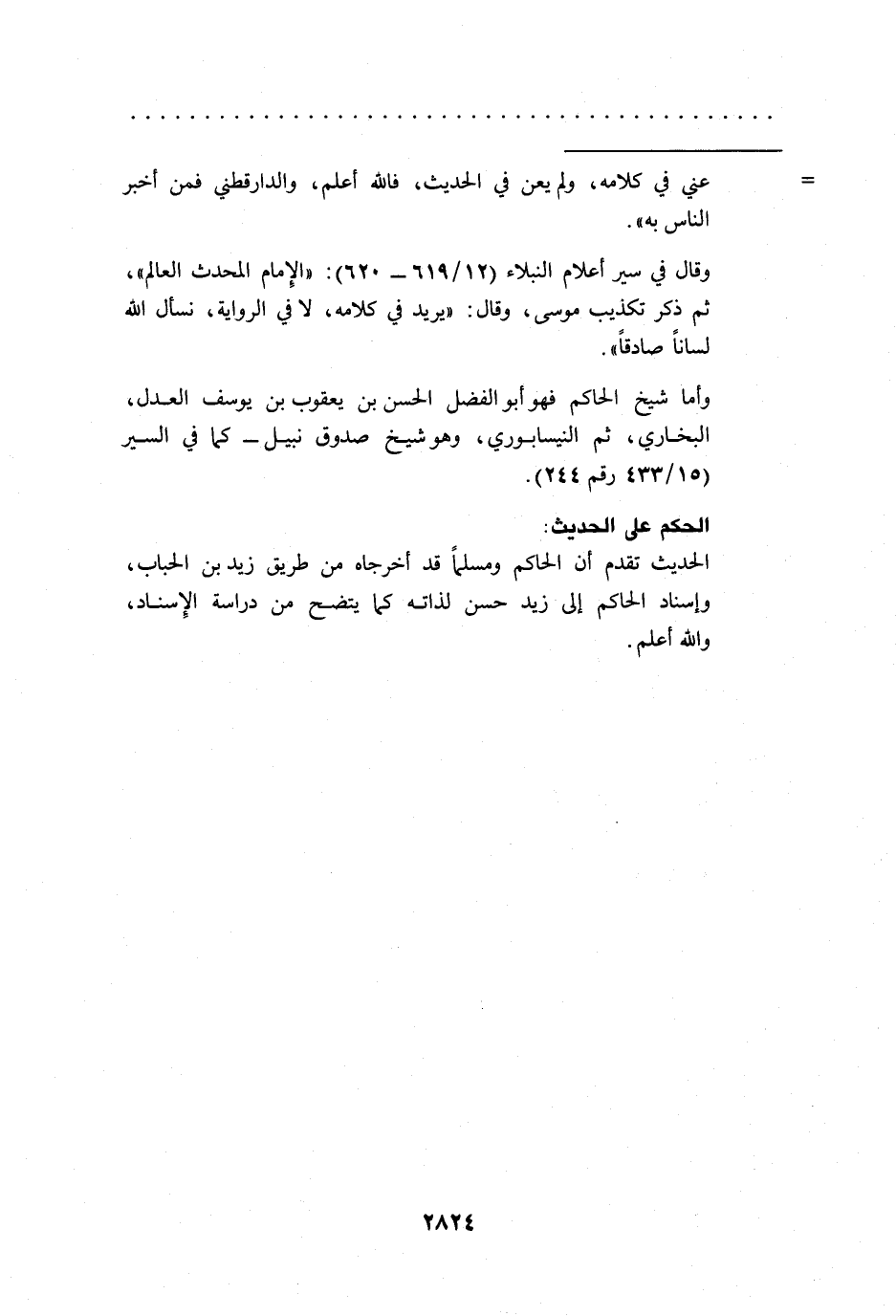 وقال في سير أعلام النبلاء (12/ 619 - 620): "الِإمام المحدث العالم"، ثم ذكر تكذيب موسى، وقال: "يريد في كلامه، لا في الرواية، نسأل الله لساناً صادقاً".
