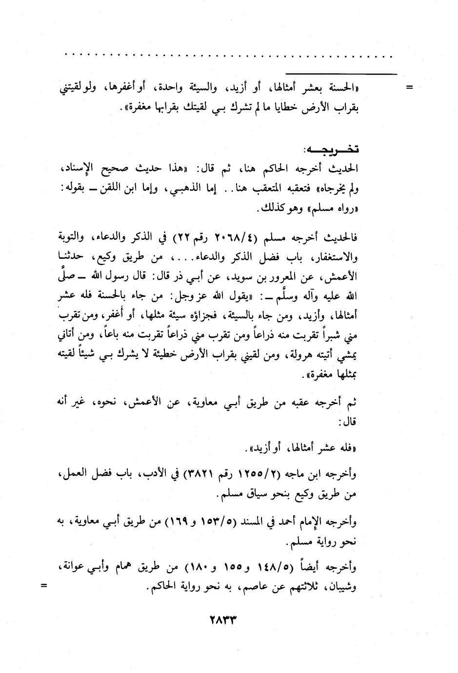 = "الحسنة بعشر أمثالها، أو أزيد، والسيئة واحدة، أو أغفرها، ولو لقيتني بقراب الأرض خطايا ما لم تشرك بي لقيتك بقرابها مغفرة".