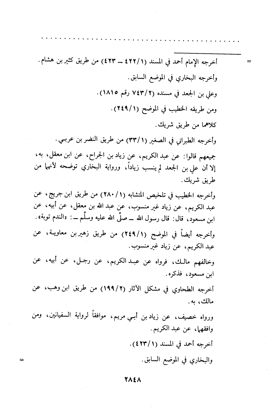 وأخرجه الخطيب في تلخيص المتشابه (1/ 280) من طريق ابن جريج، عن عبد الكريم، عن زياد غير منسوب، عن عبد الله بن معقل، عن أبيه، عن ابن مسعود، قال: قال رسول الله -صلى الله عليه وسلم-: "الندم توبة".