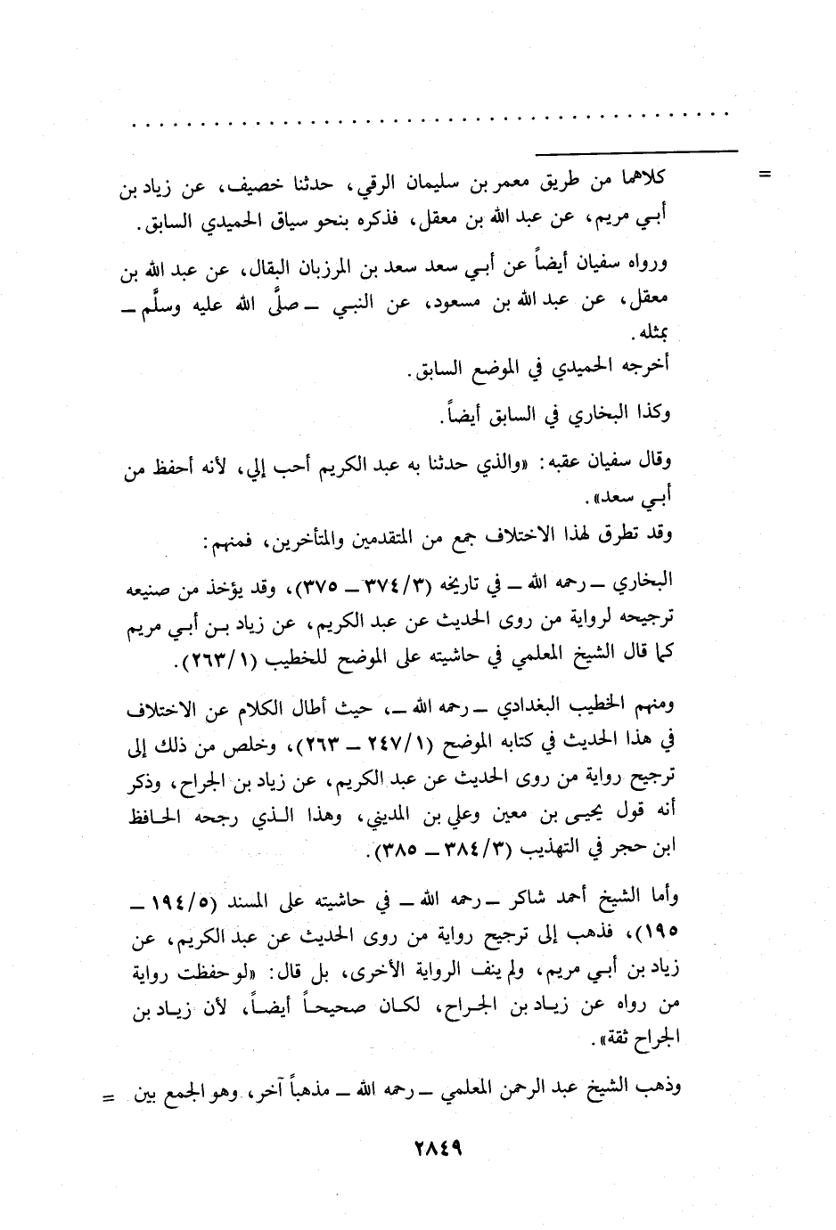 ومنهم الخطيب البغدادي -رحمه الله- حيث أطال الكلام عن الاختلاف في هذا الحديث في كتابه الموضح (1/ 247 - 263)، وخلص من ذلك إلى ترجيح رواية من روى الحديث عن عبد الكريم، عن زياد بن الجراح، وذكر أنه قول يحيى بن معين وعلي بن المديني، وهذا الذى رجحه الحافظ ابن حجر في التهذيب (3/ 384 - 385).