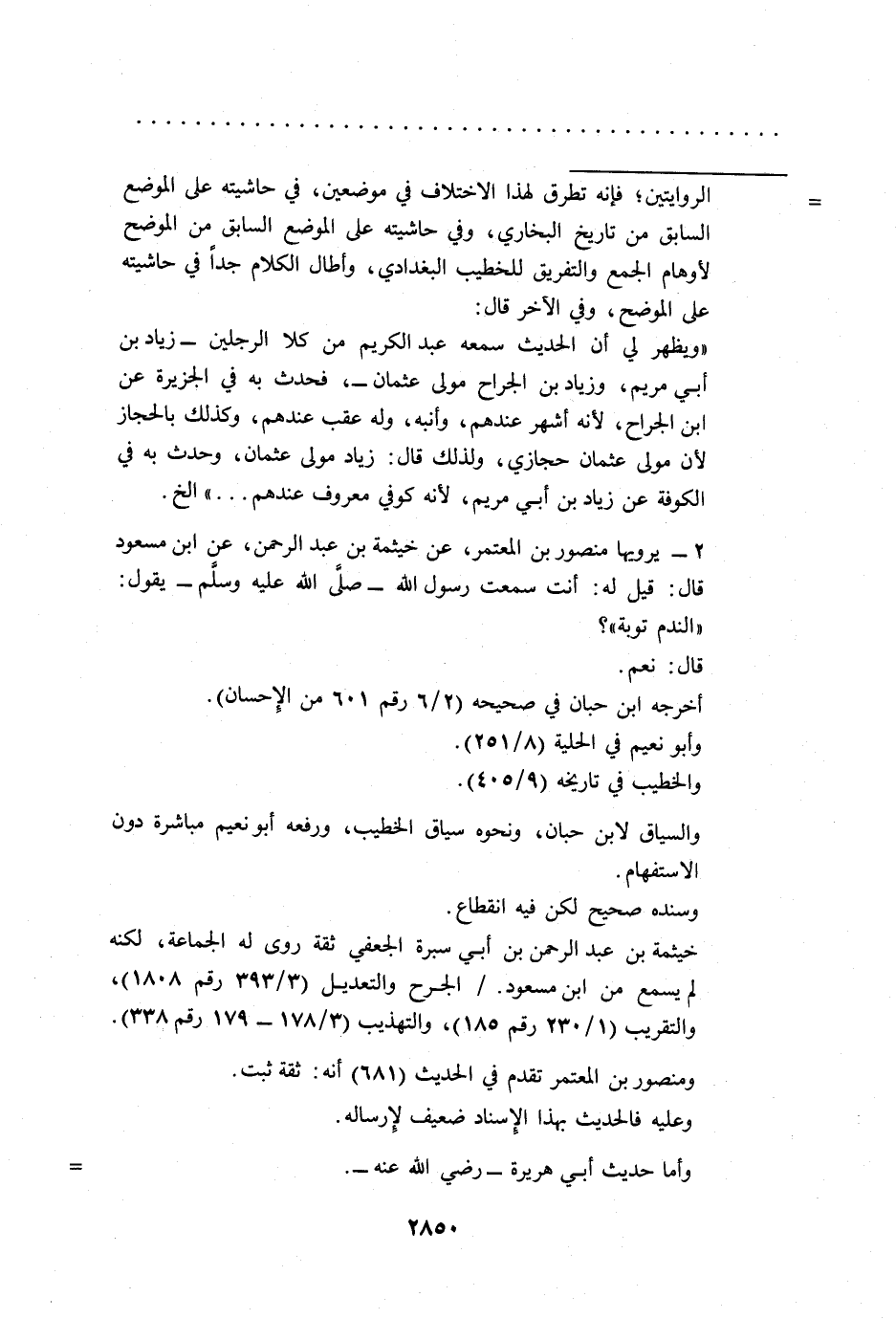 = الروايتين؛ فإنه تطرق لهذا الاختلاف في موضعي، في حاشيته على الموضع السابق من تاريخ البخاري، وفي حاشيته على الموضع السابق من الموضح لأوهام الجمع والتفريق للخطيب البغدادي، وأطال الكلام جداً في حاشيته على الموضح، وفي الآخر قال: