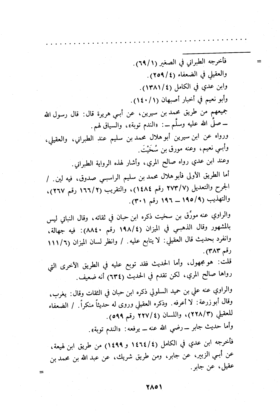 أما الطريق الأولى فأبو هلال محمد بن سليم الراسبي صدوق، فيه لين./ الجرح والتعديل (7/ 273 رقم 1484)، والتقريب (2/ 166 رقم 267)، والتهذيب (9/ 195 - 196 رقم 301).