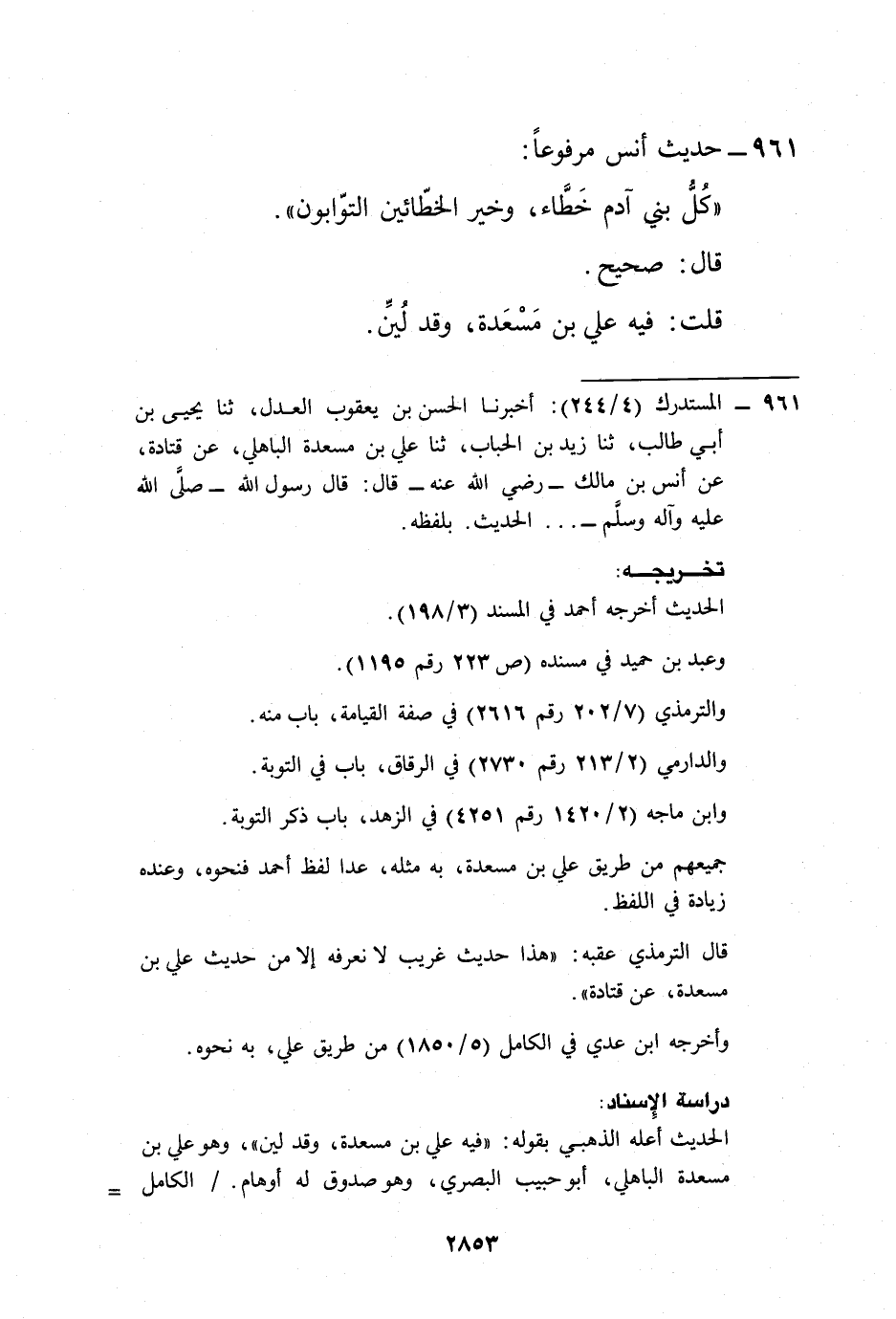 961 - المستدرك (4/ 244): أخبرنا الحسن بن يعقوب العدل، ثنا يحيى بن أبي طالب، ثنا زيد بن الحباب، ثنا علي بن مسعدة الباهلي، عن قتادة، عن أنس بن مالك -رضي الله عنه- قال: قال رسول الله -صلى الله عليه وآله وسلم- ... الحديث. بلفظه.