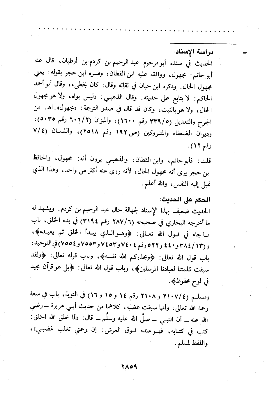 الحديث ضعيف بهذا الإِسناد لجهالة حال عبد الرحيم بن كردم. ويشهد له ما أخرجه البخاري في صحيحه (6/ 287 رقم 3194) في بدء الخلق، باب ما جاء في قول الله تعالى: {وهو الذي يبدأ الخلق ثم يعيده}، و (13/ 384 و 440 و 522 رقم 7404و 7453 و 7553 و 7554) في التوحيد، باب قول الله تعالى: {ويحذركم الله نفسه}، وباب قوله تعالى: {ولقد سبقت كلمتنا لعبادنا المرسلين}، وباب قول الله تعالى: {بل هو قرآن مجيد في لوح محفوظ}.