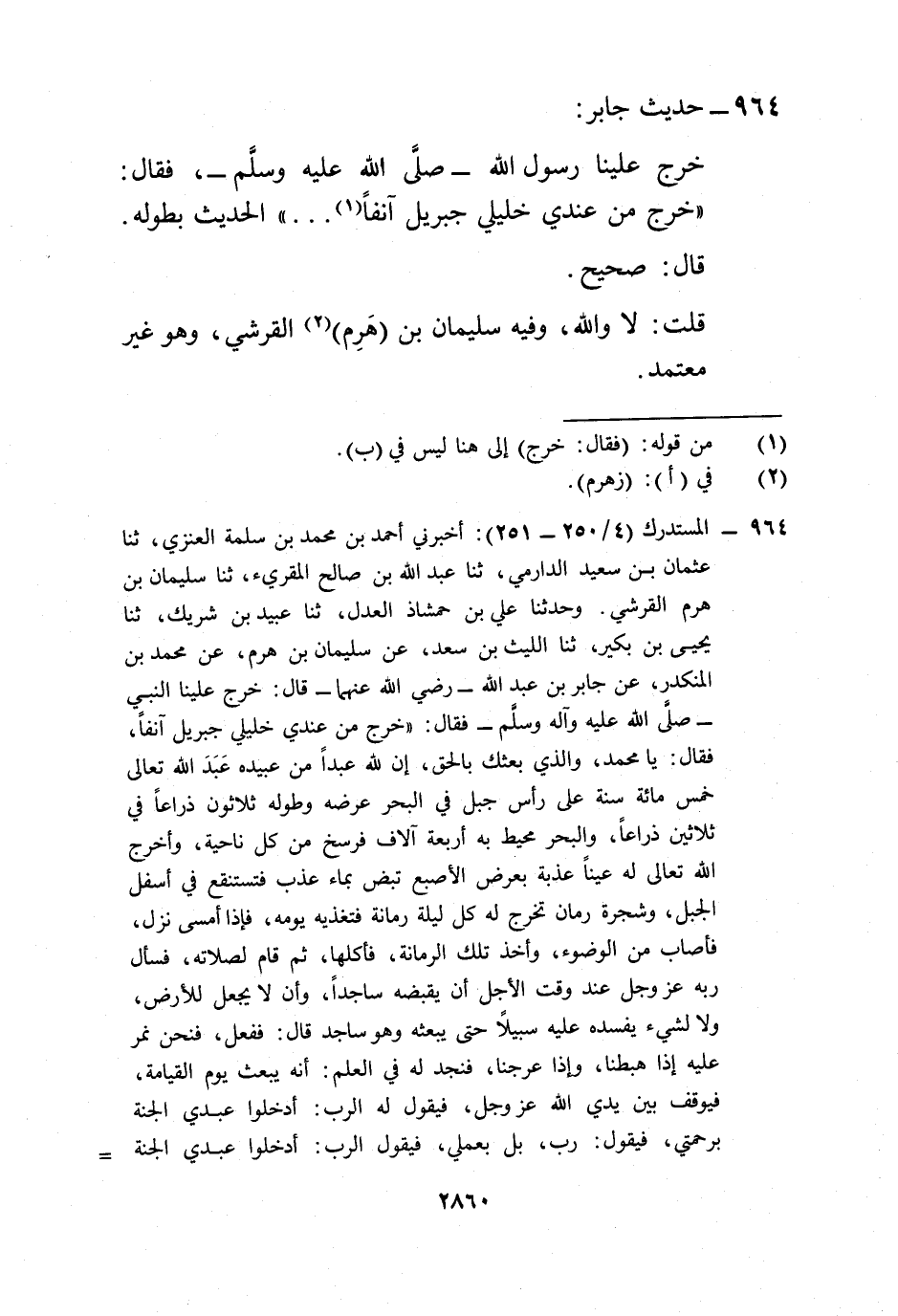 964 - المستدرك (4/ 250 - 251): أخبرني أحمد بن محمد بن سلمة العنزي، ثنا عثمان بن سعيد الدارمي، ثنا عبد الله بن صالح المقريء، ثنا سليمان بن هرم القرشي. وحدثنا علي بن حمشاذ العدل، ثنا عبيد بن شريك، ثنا يحيى بن بكير، ثنا الليث بن سعد، عن سليمان بن هرم، عن محمد بن المنكدر، عن جابر بن عبد الله -رضي الله عنهما- قال: خرج علينا النبي -صلى الله عليه وآله وسلم- فقال: "خرج من عندي خليلي جبريل آنفاً، فقال: يا محمد، والذي بعثك بالحق، إن لله عبداً من عبيده عَبَدَ الله تعالى خمس مائة سنة على رأس جبل في البحر عرضه وطوله ثلاثون ذراعاً في ثلاثين ذراعاً، والبحر محيط به أربعة آلاف فرسخ من كل ناحية، وأخرج الله تعالى له عيناً عذبة بعرض الأصبع تبض بماء عذب فتستنقع في أسفل الجبل، وشجرة رمان تخرج له على ليلة رمانة فتغذيه يومه، فإذا أمسى نزل، فأصاب من الوضوء، وأخذ تلك الرمانة، فأكلها، ثم قام لصلاته، فسأل ربه عز وجل عند وقت الأجل أن يقبضه ساجداً، وأن لا يجعل للأرض، ولا لشيء يفسده عليه سبيلاً حتى يبعثه وهو ساجد قال: ففعل، فنحن نمر عليه إذا هبطنا، وإذا عرجنا، فنجد له في العلم: أنه يبعث يوم القيامة، فيوقف بين يدي الله عز وجل، فيقول له الرب: أدخلوا عبدي الجنة برحمتي، فيقول: رب، بل بعملي، فيقول الرب: أدخلوا عبدي الجنة =