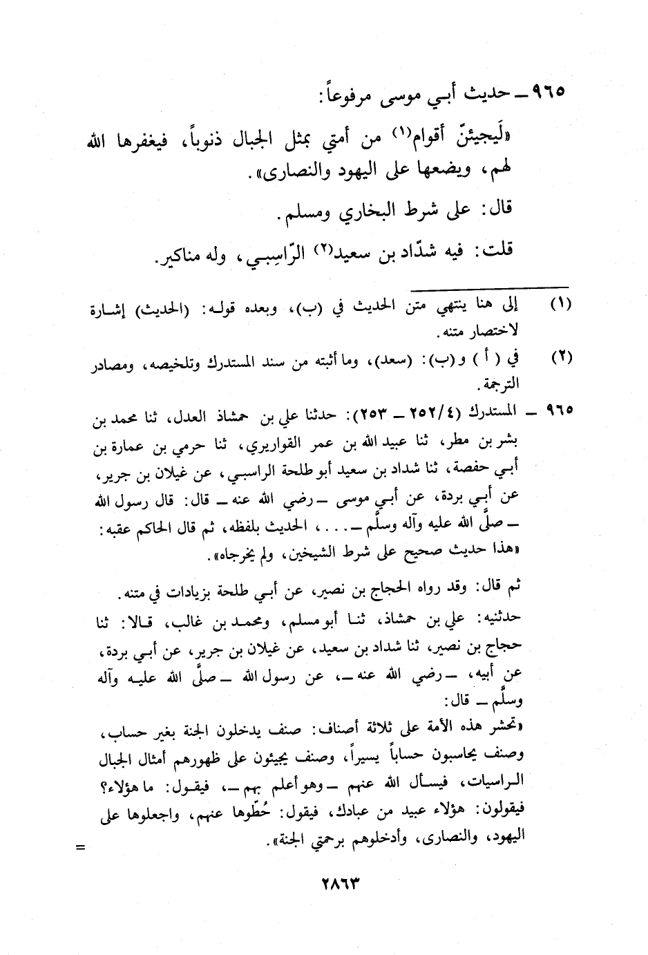 965 - المستدرك (4/ 252 - 253): حدثنا علي بن حمشاذ العدل، ثنا محمد بن بشر بن مطر، ثنا عبيد الله بن عمر القواريري، ثنا حرمي بن عمارة بن أبي حفصة، ثنا شداد بن سعيد أبو طلحة الراسبي، عن غيلان بن جرير، عن أبي بردة، عن أبي موسى -رضي الله عنه- قال: قال رسول الله -صلى الله عليه وآله وسلم- ... ، الحديث بلفظه، ثم قال الحاكم عقبه: "هذا حديث صحيح على شرط الشيخين، ولم يخرجاه".