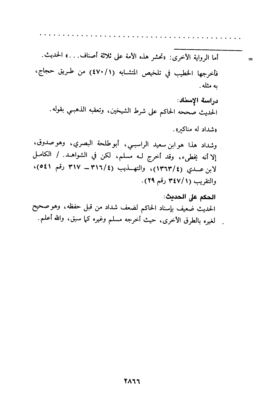 وشداد هذا هو ابن سعيد الراسبي، أبو طلحة البصري، وهو صدوق، إلا أنه يخطيء، وقد أخرج له مسلم، لكن في الشواهد./ الكامل لابن عدي (4/ 1363)، والتهذيب (6/ 314 - 317 رقم 541)، والتقريب (1/ 347 رقم 29).