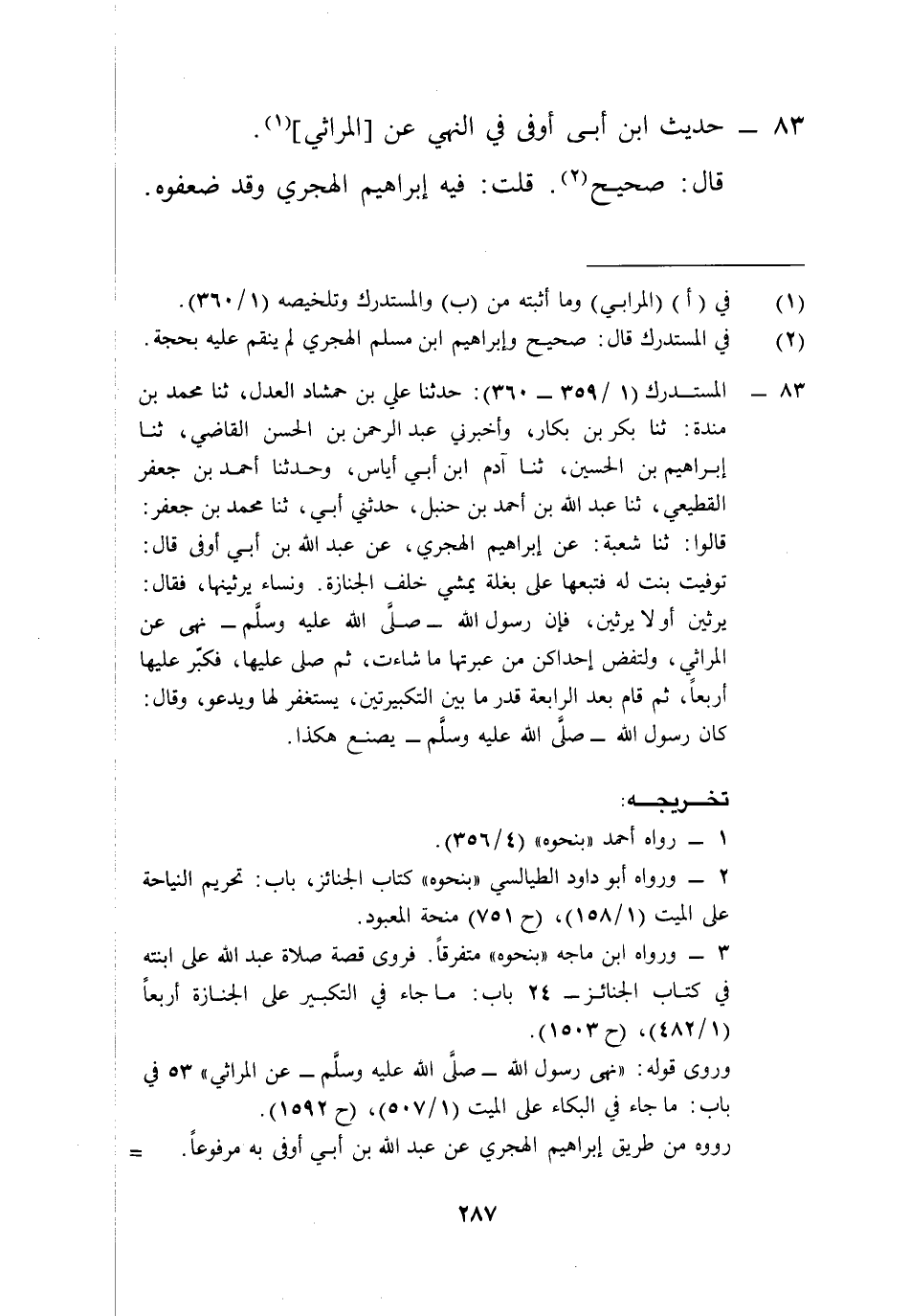 83 - المستدرك (1/ 359 - 360): حدثنا علي بن حمشاد العدل، ثنا محمد بن مندة: ثنا بكر بن بكار، وأخبرني عبد الرحمن بن الحسن القاضي، ثنا إبراهيم بن الحسين، ثنا آدم ابن أبي أياس، وحدثنا أحمد بن جعفر القطيعي، ثنا عبد الله بن أحمد بن حنبل، حدثني أبي، ثنا محمد بن جعفر: قالوا: ثنا شعبة: عن إبراهيم الهجري، عن عبد الله بن أبي أوفى قال: توفيت بنت له فتبعها على بغلة يمشي خلف الجنازة. ونساء يرثينها، فقال: يرثن أو لا يرثين، فإن رسول الله -صلى الله عليه وسلم- نهى عن المراثي، ولتفض إحداكن من عبرتها ما شاءت، ثم صلى عليها، فكبّر عليها أربعاً، ثم قام بعد الرابعة قدر ما بين التكبيرتين، يستغفر لها ويدعو، وقال: كان رسول الله -صلى الله عليه وسلَّم- يصنع هكذا.
