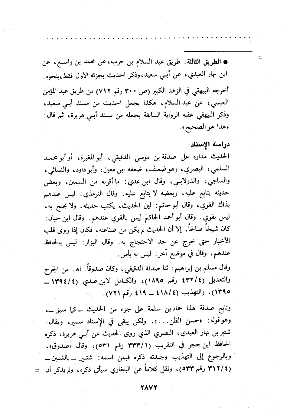 = * الطريق الثالثة: طريق عبد السلام بن حرب، عن محمد بن واسع، عن ابن نهار العبدي، عن أبي سعيد، وذكر الحديث بجزئه الأول فقط، بنحوه.