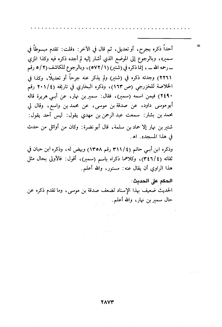 = أحداً ذكره بجرح، أو تعديل، ثم قال في الآخر: "قلت: تقدم مبسوطاً في سمير"، وبالرجوع إلى الموضع الذي أشار إليه لم أجده ذكره فيه وكذا المزي -رحمه الله-، إنما ذكره في (شتير) (1/ 572)، وبالرجوع للكاشف (2/ 5 رقم 2261) وجدته ذكره في (شتير) ولم يذكر عنه جرحاً أو تعديلًا، وكذا في الخلاصة للخزرجي (ص 163)، وذكره البخاري في تاريخه (4/ 201 رقم 2490) فيمن اسمه (سمير)، فقال: سمير بن نهار، عن أبي هريرة قاله أبو موسى داود، عن صدقة بن موسى، عن محمد بن واسع، وقال لي محمد بن بشار: سمعت عبد الرحمن بن مهدي يقول: ليس أحد يقول: شتير بن نهار إلا حماد بن سلمة، قال أبو نضرة: وكان من أوائل من حدث في هذا المسجد". اهـ.