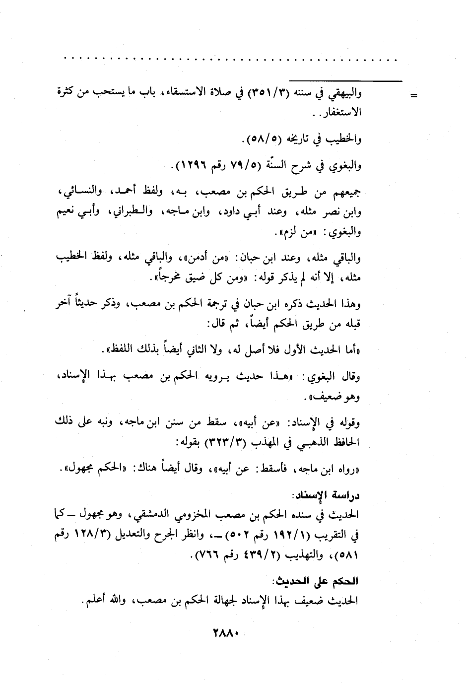 وقال البغوي: "هذا حديث يرويه الحكم بن مصعب بهذا الِإسناد، وهو ضعيف".