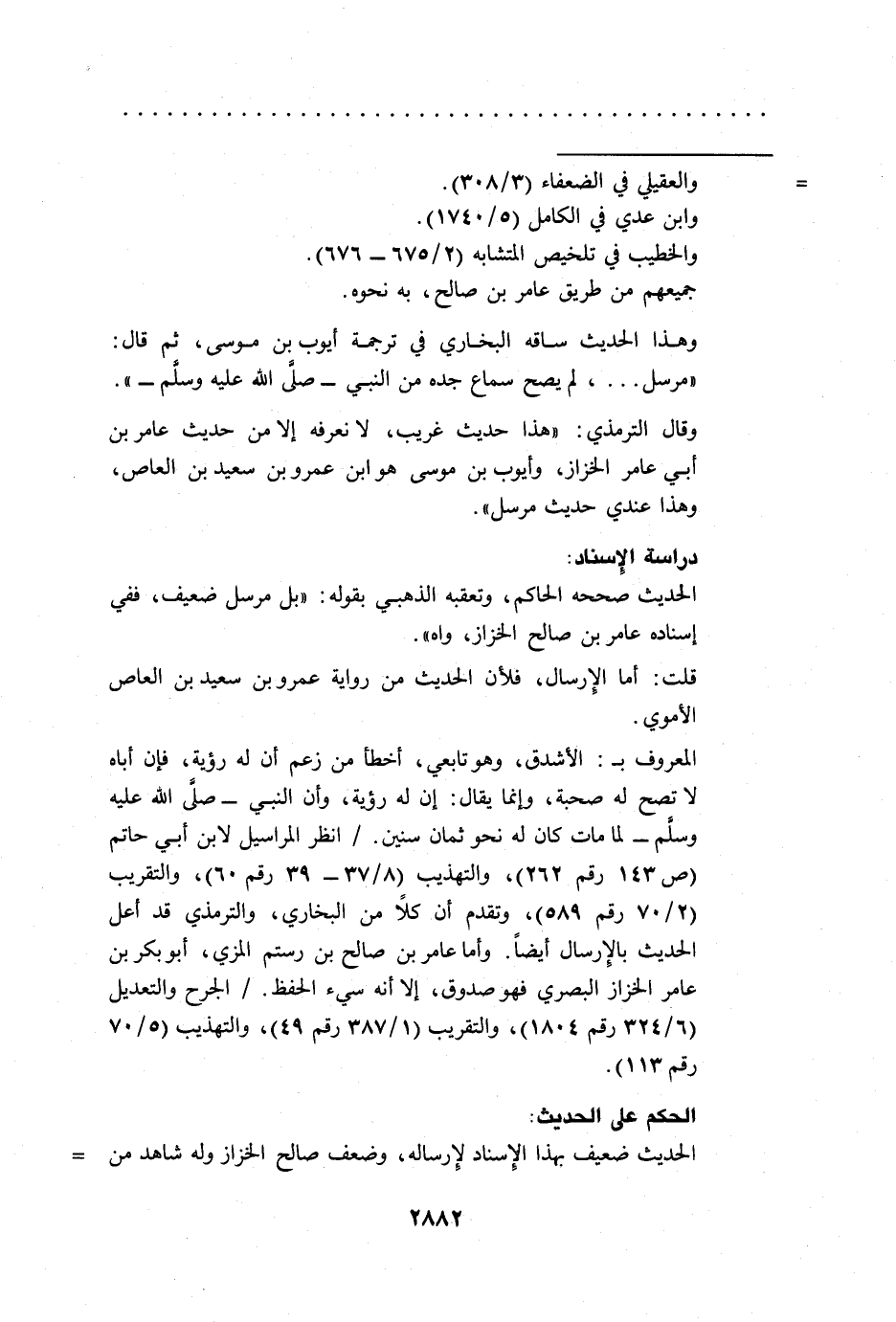 وقال الترمذي: "هذا حديث غريب، لا نعرفه إلا من حديث عامر بن أبي عامر الخزاز، وأيوب بن موسى هو ابن عمرو بن سعيد بن العاص، وهذا عندي حديث مرسل".