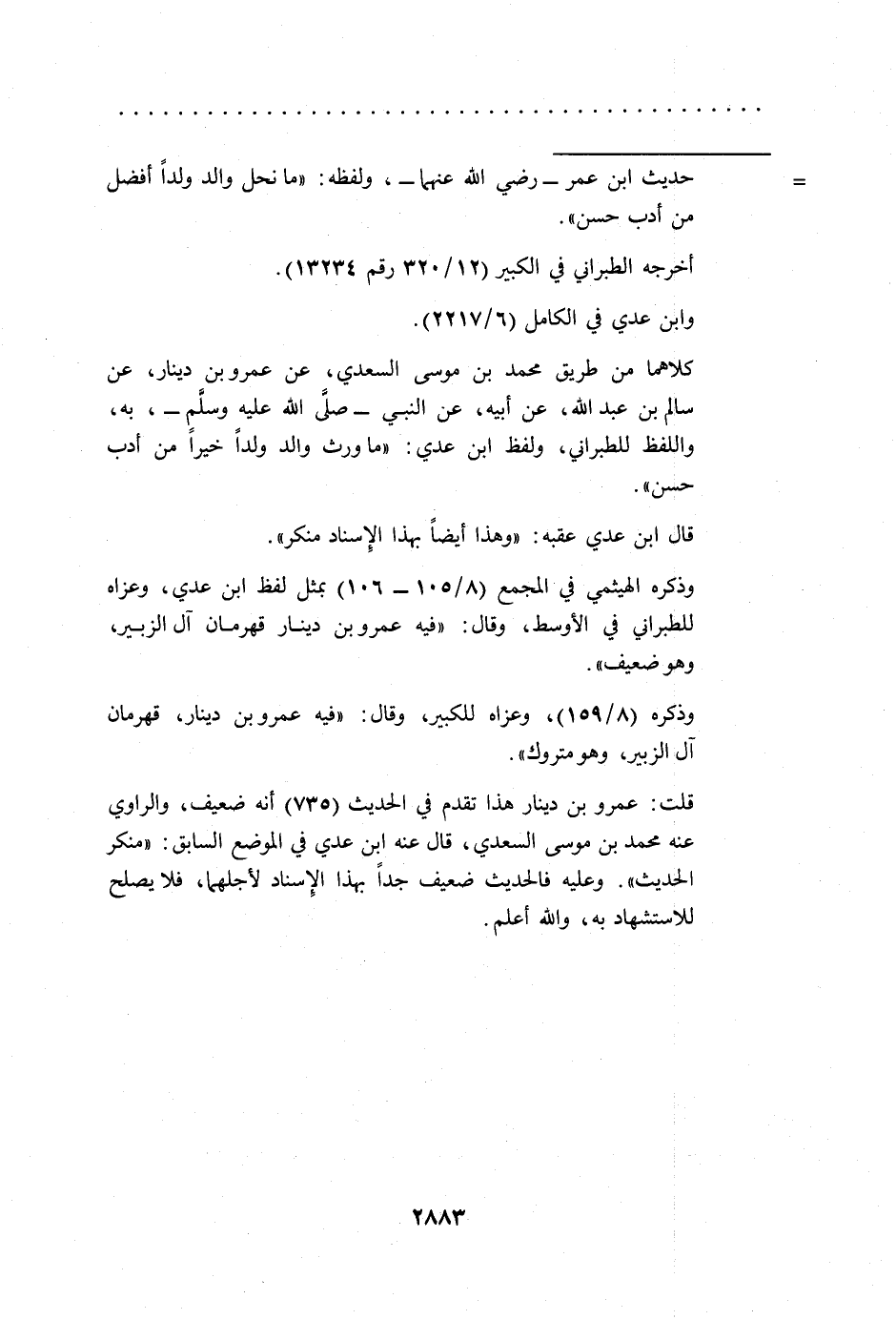 كلاهما من طريق محمد بن موسى السعدي، عن عمرو بن دينار، عن سالم بن عبد الله، عن أبيه، عن النبي -صلى الله عليه وسلم-، به، واللفظ للطبراني، ولفظ ابن عدي: "ما ورث والد ولداً خيراً من أدب حسن".