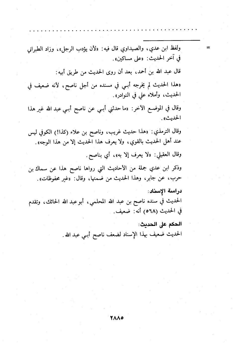 "هذا الحديث لم يخرجه أبي في مسنده من أجل ناصح، لأنه ضعيف في الحديث، وأملاه علي في النوادر".