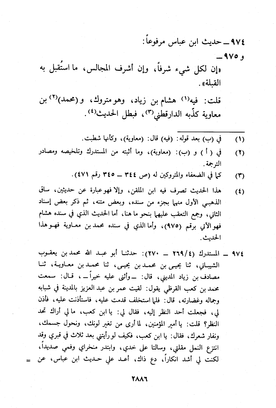 (¬4) هذا الحديث تصرف فيه ابن الملقن، وإلا فهو عبارة عن حديثين، ساق الذهبي الأول منهما بجزء من سنده، وبعض متنه، ثم ذكر بعض إسناد الثاني، وجمع التعقب عليهما بنحو ما هنا، أما الحديث الذي في سنده هشام فهو الآتي برقم (975)، وأما الذي في سنده محمد بن معاوية فهو هذا الحديث.