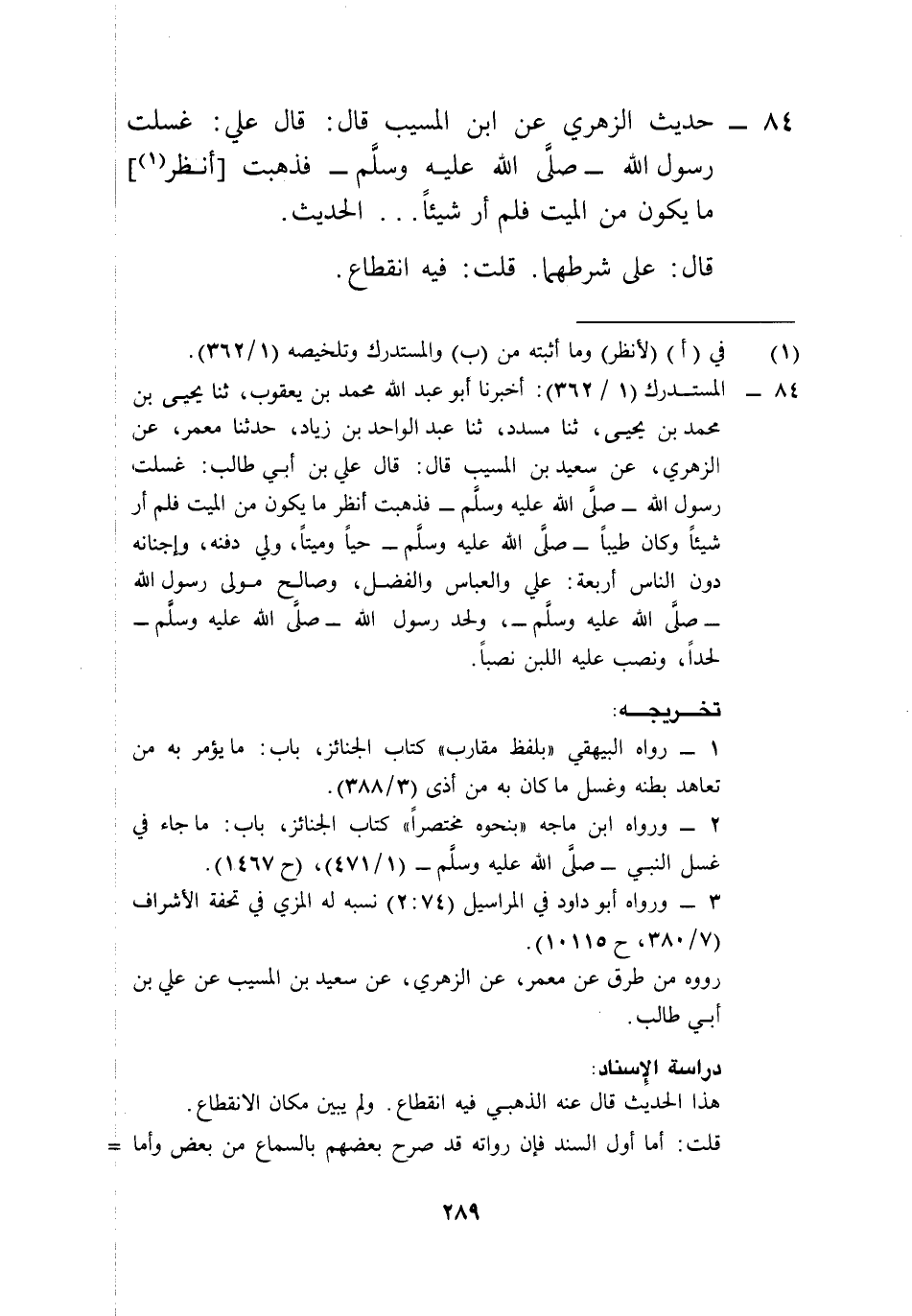 84 - المستدرك (1/ 362): أخبرنا أبو عبد الله محمد بن يعقوب، ثنا يحيى بن محمد بن يحيى، ثنا مسدد، ثنا عبد الواحد بن زياد، حدثنا معمر، عن الزهري، عن سعيد بن المسيب قال: قال علي بن أبي طالب: غسلت رسول الله -صلى الله عليه وسلم- فذهبت أنظر ما يكون من الميت فلم أر شيئاً وكان طيباً -صلى الله عليه وسلم- حياً وميتاً، ولي دفنه، وإجنانه دون الناس أربعة: علي والعباس والفضل، وصالح مولى رسول الله -صلى الله عليه وسلم-، ولحد رسول الله -صلَّى الله عليه وسلم- لحداً، ونصب عليه اللبن نصباً.