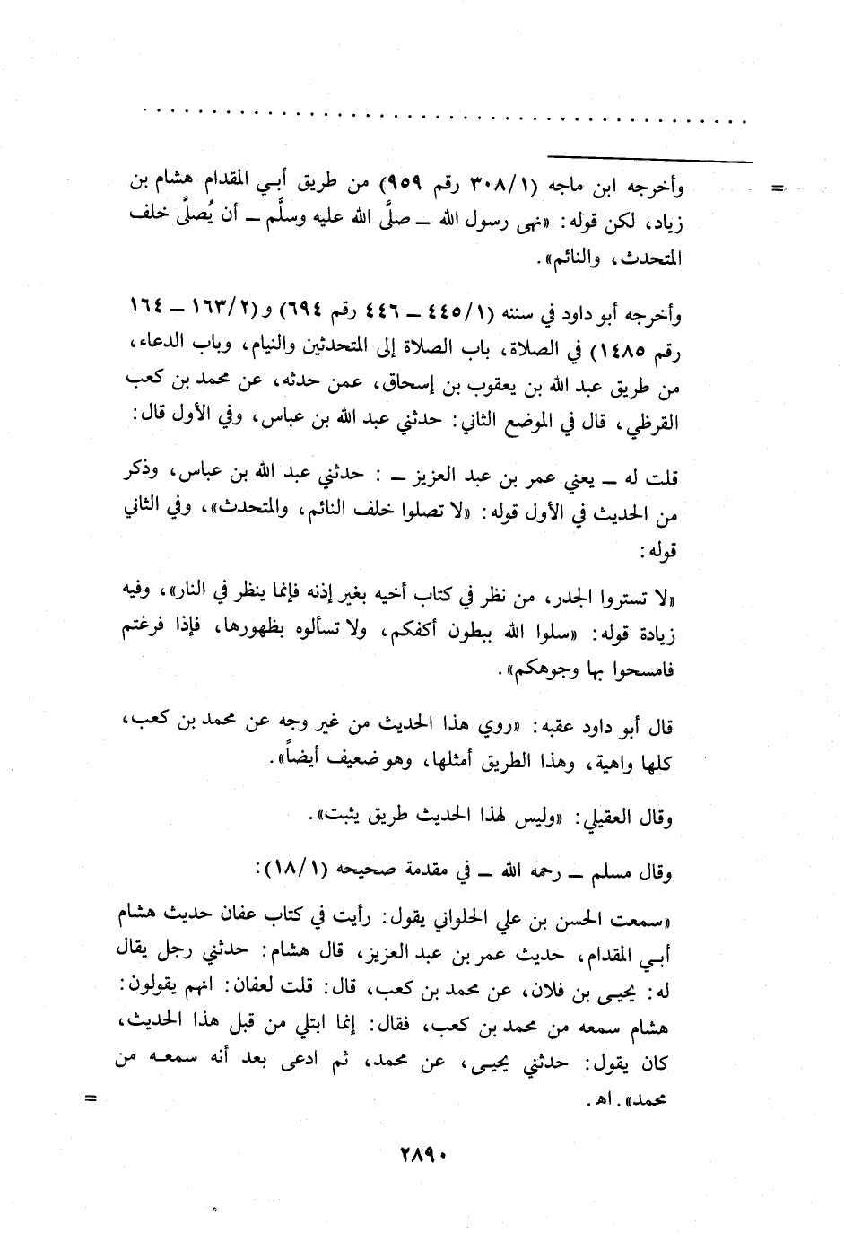 قلت له -يعني عمر بن عبد العزيز-: حدثني عبد الله بن عباس، وذكر من الحديث في الأول قوله: "لا تصلوا خلف النائم، والمتحدث"، وفي الثاني قوله: