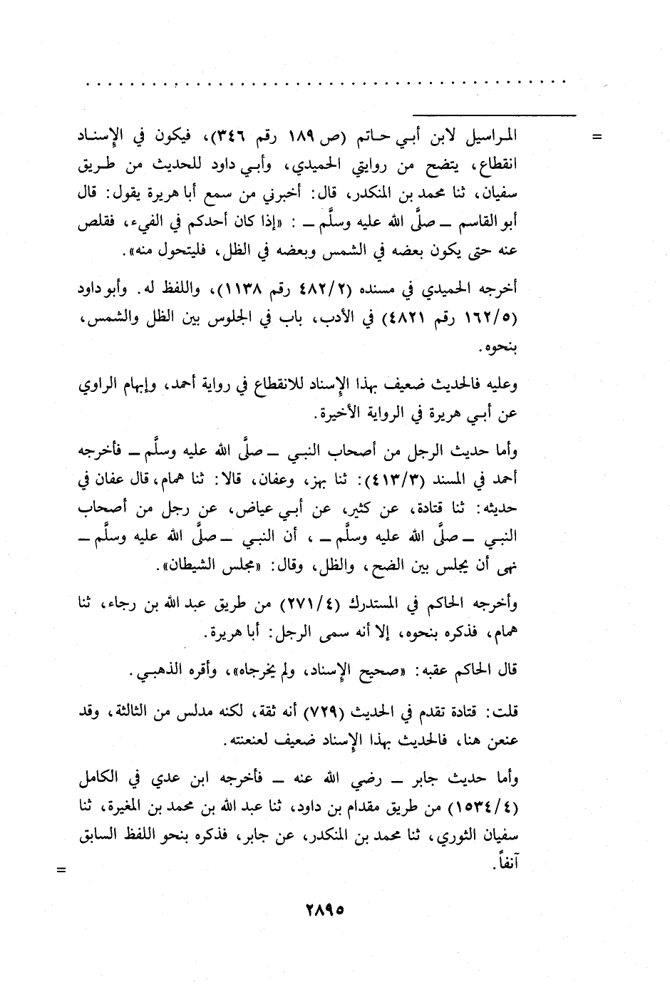 = المراسيل لابن أبي حاتم (ص 189 رقم 346)، فيكون في الِإسناد انقطاع، يتضح من روايتي الحميدي، وأبي داود للحديث من طريق سفيان، ثنا محمد بن المنكدر، قال: أخبرني من سمع أبا هريرة يقول: قال أبو القاسم -صلى الله عليه وسلم-: "إذا كان أحدكم في الفيء، فقلص عنه حتى يكون بعضه في الشمس وبعضه في الظل، فليتحول منه".