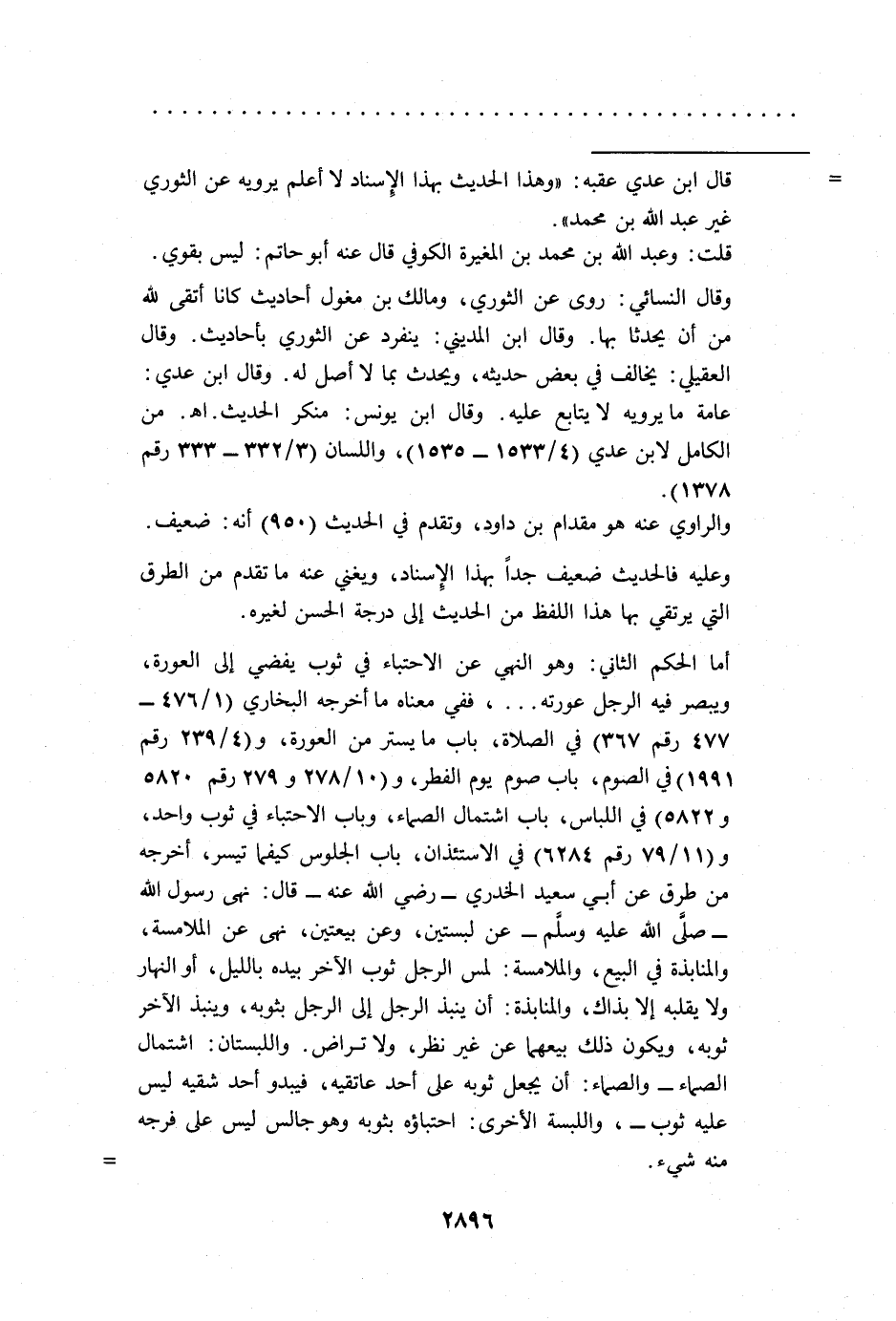 أما الحكم الثاني: وهو النهي عن الاحتباء في ثوب يفضي إلى العورة، ويبصر فيه الرجل عورته ... ، ففي معناه ما أخرجه البخاري (1/ 476 - 477 رقم 367) في الصلاة، باب ما يستر من العورة، و (4/ 239رقم 1991) في الصوم، باب صوم يوم الفطر، و (10/ 278و 279 رقم 5820 و 5822) في اللباس، باب اشتمال الصماء، وباب الاحتباء في ثوب واحد، و (11/ 79 رقم 6284) في الاستئذان، باب الجلوس كيفما تيسر، أخرجه من طرق عن أبي سعيد الخدري -رضي الله عنه- قال: نهى رسول الله -صلى الله عليه وسلم- عن لبستين، وعن بيعتين، نهى عن الملامسة، والمنابذة في البيع، والملامسة: لمس الرجل ثوب الآخر بيده بالليل، أو النهار ولا يقلبه إلا بذاك، والمنابذة: أن ينبذ الرجل إلى الرجل بثوبه، وينبذ الآخر ثوبه، ويكون ذلك بيعهما عن غير نظر، ولا تراض. واللبستان: اشتمال الصماء -والصماء: أن يجعل ثوبه على أحد عاتقيه، فيبدو أحد شقيه ليس عليه ثوب-، واللبسة الأخرى: احتباؤه بثوبه وهو جالس ليس على فرجه منه شيء. =