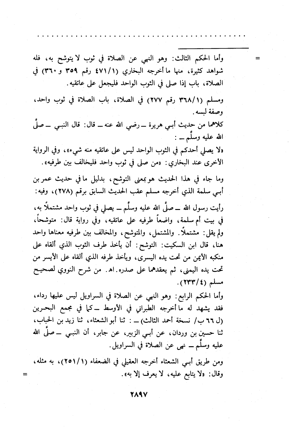 = وأما الحكم الثالث: وهو النهي عن الصلاة في ثوب لا يتوشح به، فله شواهد كثيرة، منها ما أخرجه البخاري (1/ 471 رقم 359 و 360) في الصلاة، باب إذا صلى في الثوب الواحد فليجعل على عاتقيه.