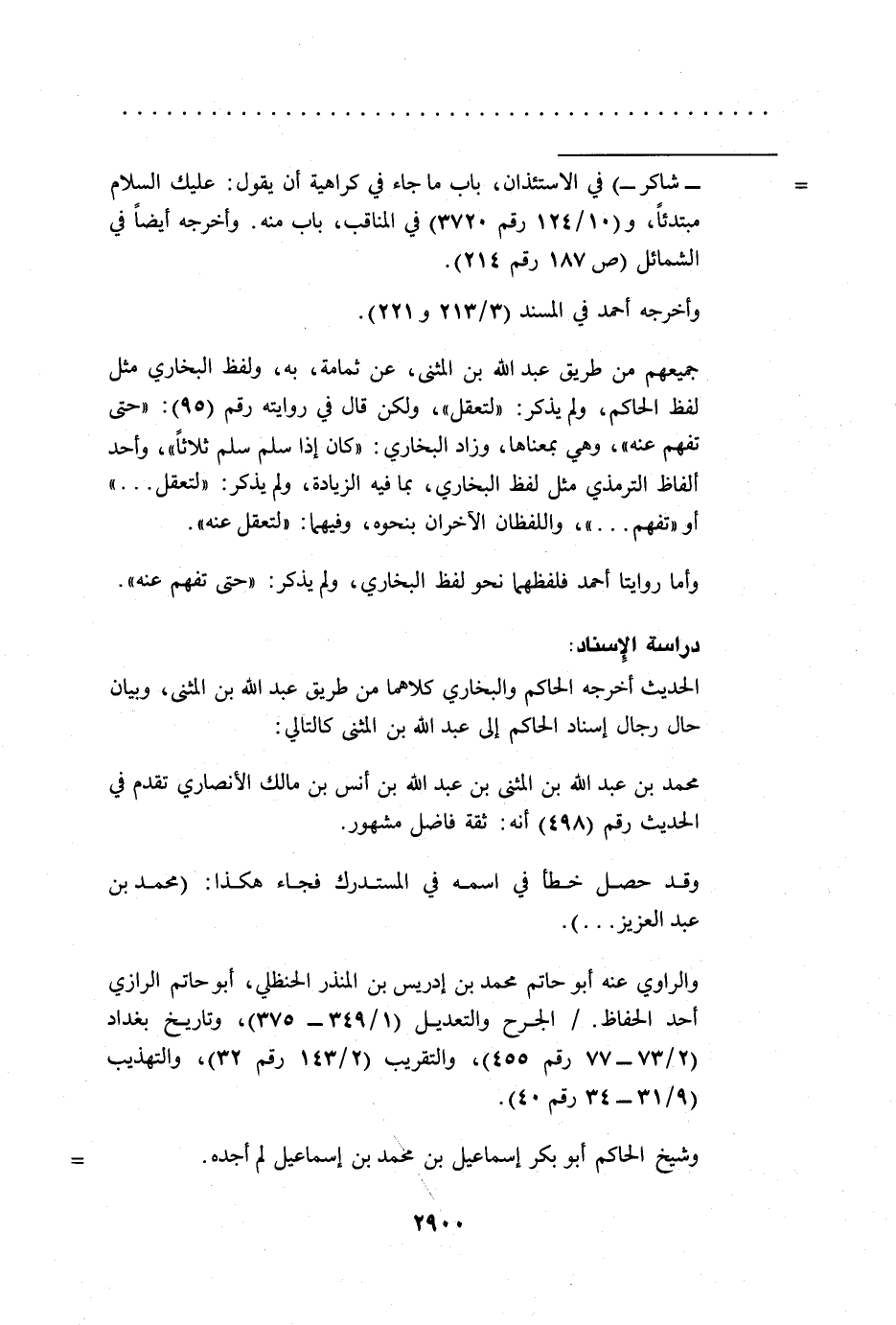 = -شاكر-) في الاستئذان، باب ما جاء في كراهية أن يقول: عليك السلام مبتدئاً، و (10/ 124 رقم 3720) في المناقب، باب منه. وأخرجه أيضاً في الشمائل (ص 187 رقم 214).