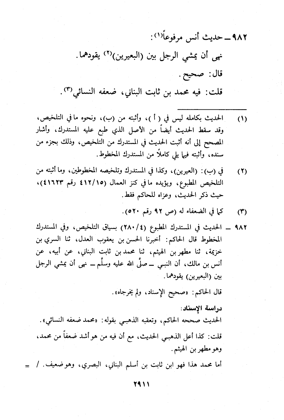 982 - الحديث في المستدرك المطبوع (4/ 280) بسياق التلخيص، وفي المستدرك المخطوط قال الحاكم: أخبرنا الحسن بن يعقوب العدل، ثنا السري بن خزيمة، ثنا مطهر بن الهيثم، ثنا محمد بن ثابت البناني، عن أبيه، عن أنس بن مالك، أن النبي -صلى الله عليه وسلم- نهى أن يمشي الرجل بين (البعيرين) يقودهما.