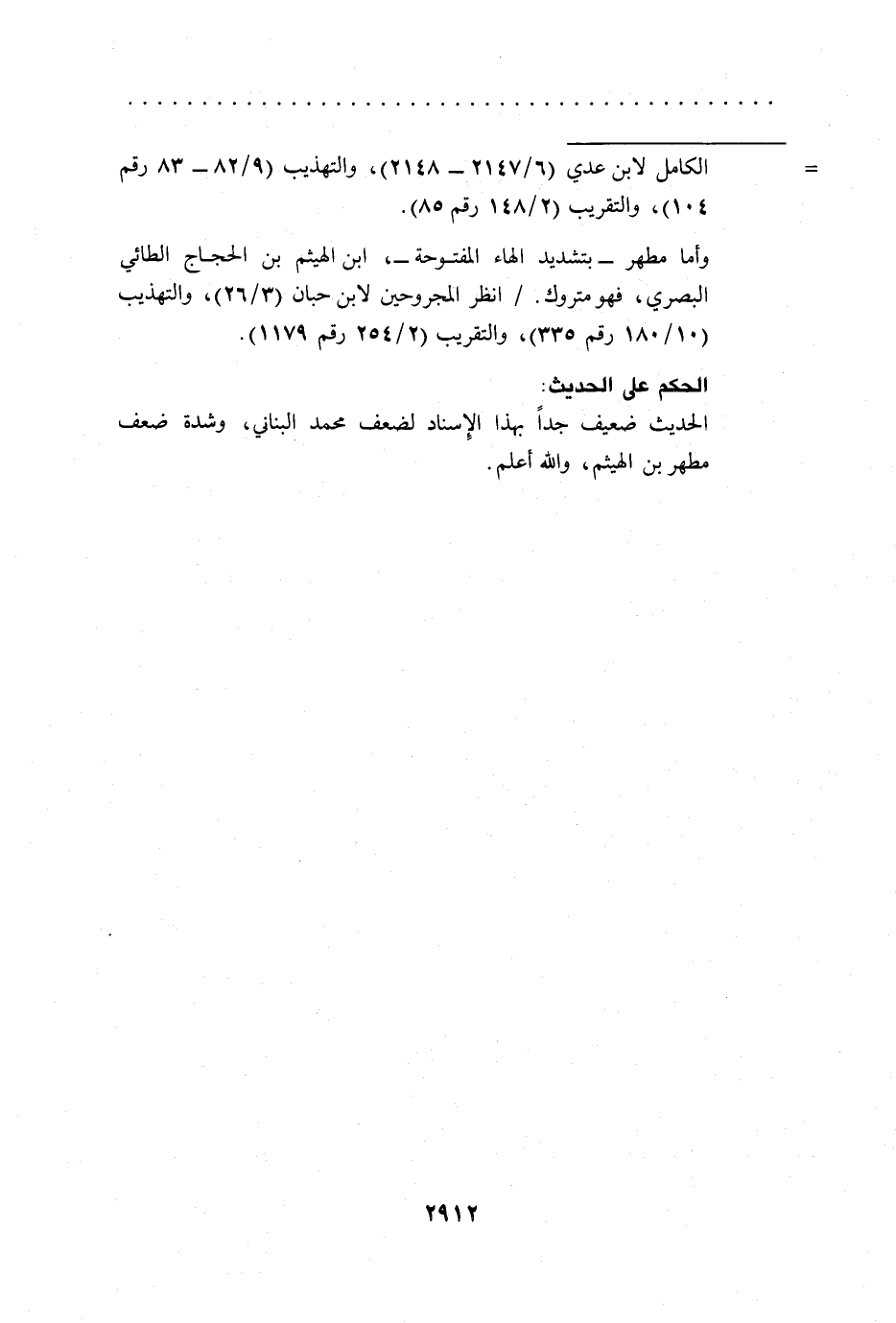 وأما مطهر -بتشديد الهاء المفتوحة-، ابن الهيثم بن الحجاج الطائي البصري، فهو متروك./ انظر المجروحين لابن حبان (3/ 26)، والتهذيب (10/ 180 رقم 335)، والتقريب (2/ 254 رقم 1179).