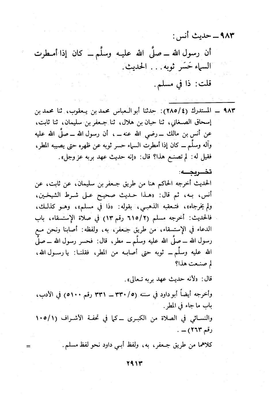 983 - المستدرك (4/ 285): حدثنا أبو العباس محمد بن يعقوب، ثنا محمد بن إسحاق الصغاني، ثنا حبان بن هلال، ثنا جعفر بن سليمان، ثنا ثابت، عن أنس بن مالك -رضي الله عنه-، أن رسول الله -صلى الله عليه وآله وسلم- كان إذا أمطرت السماء حسر ثوبه عن ظهره حتى يصيبه المطر، فقيل له: لم تصنع هذا؟ قال: "إنه حديث عهد بربه عز وجل".