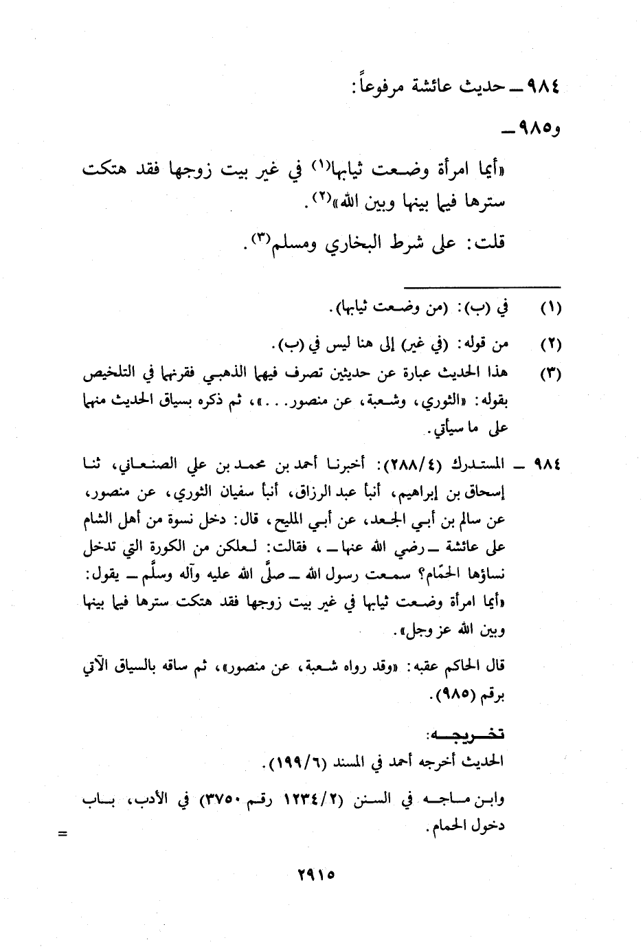 984 - المستدرك (4/ 288): أخبرنا أحمد بن محمد بن علي الصنعاني، ثنا إسحاق بن إبراهيم، أنبأ عبد الرزاق، أنبأ سفيان الثوري، عن منصور، عن سالم بن أبي الجعد، عن أبي المليح، قال: دخل نسوة من أهل الشام على عائشة -رضي الله عنها-، فقالت: لعلكن من الكورة التي تدخل نساؤها الحمّام؟ سمعت رسول الله -صلى الله عليه وآله وسلم- يقول: "أيما امرأة وضعت ثيابها في غير بيت زوجها فقد هتكت سترها فيما بينها وبين الله عز وجل".