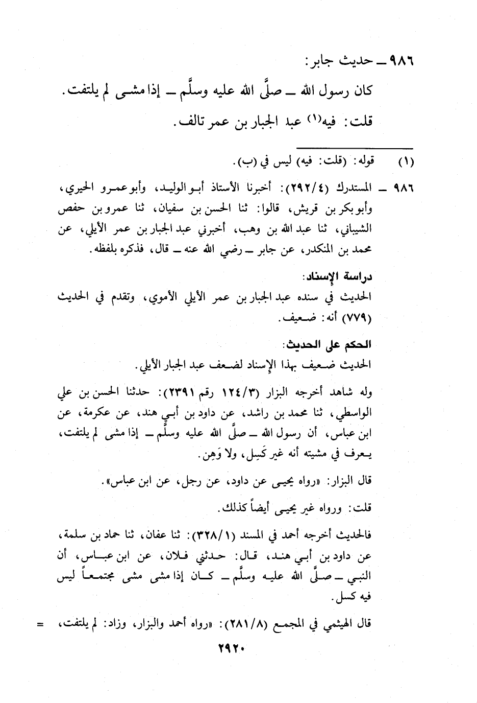 986 - المستدرك (4/ 292): أخبرنا الأستاذ أبو الوليد، وأبو عمرو الحيري، وأبو بكر بن قريش، قالوا: ثنا الحسن بن سفيان، ثنا عمرو بن حفص الشيباني، ثنا عبد الله بن وهب، أخبرني عبد الجبار بن عمر الأيلي، عن محمد بن المنكدر، عن جابر -رضي الله عنه- قال، فذكره بلفظه.