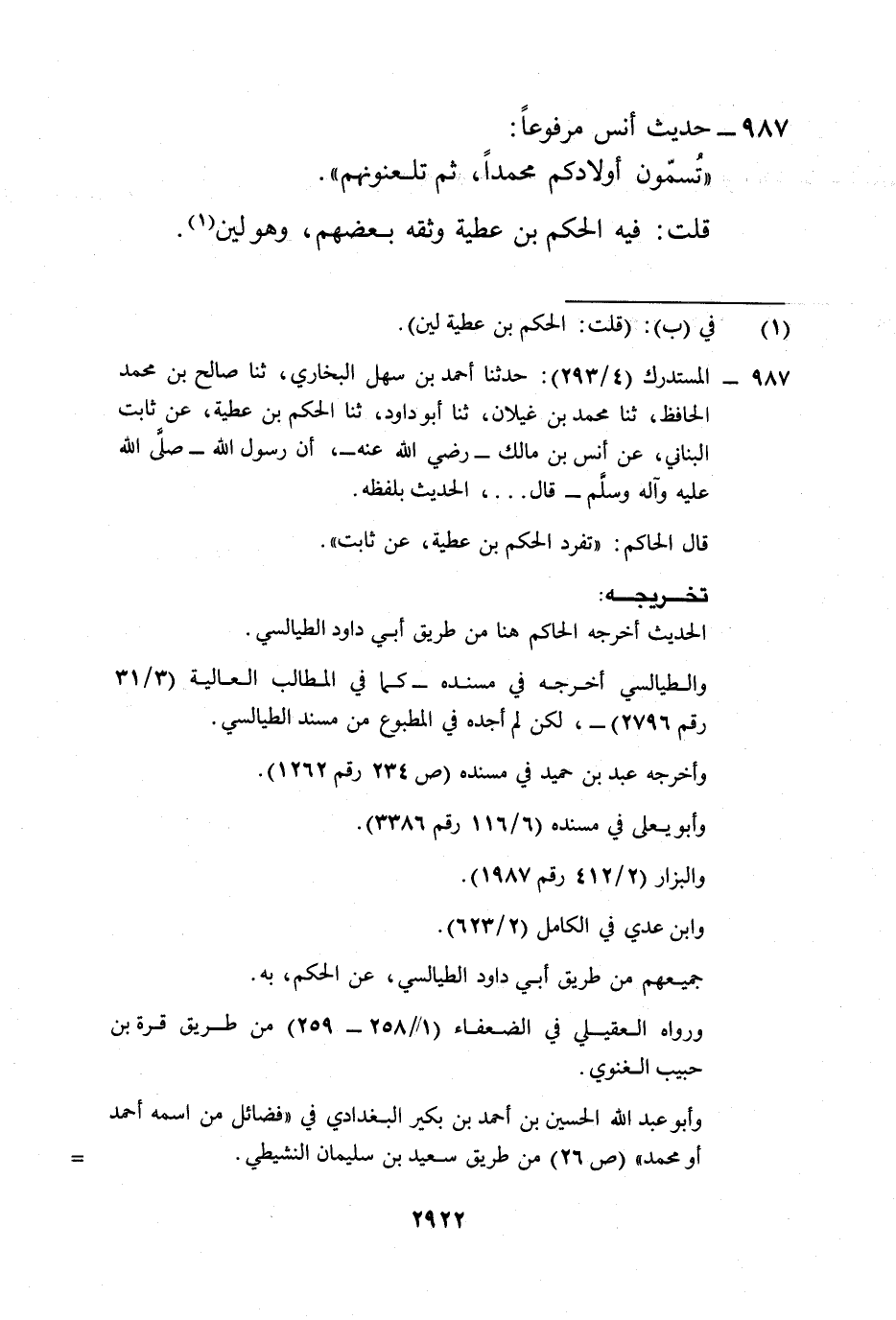 987 - المستدرك (4/ 293): حدثنا أحمد بن سهل البخاري، ثنا صالح بن محمد الحافظ، ثنا محمد بن غيلان، ثنا أبو داود، ثنا الحكم بن عطية، عن ثابت البناني، عن أنس بن مالك -رضي الله عنه -، أن رسول الله -صلى الله عليه وآله وسلم- قال ... ، الحديث بلفظه.