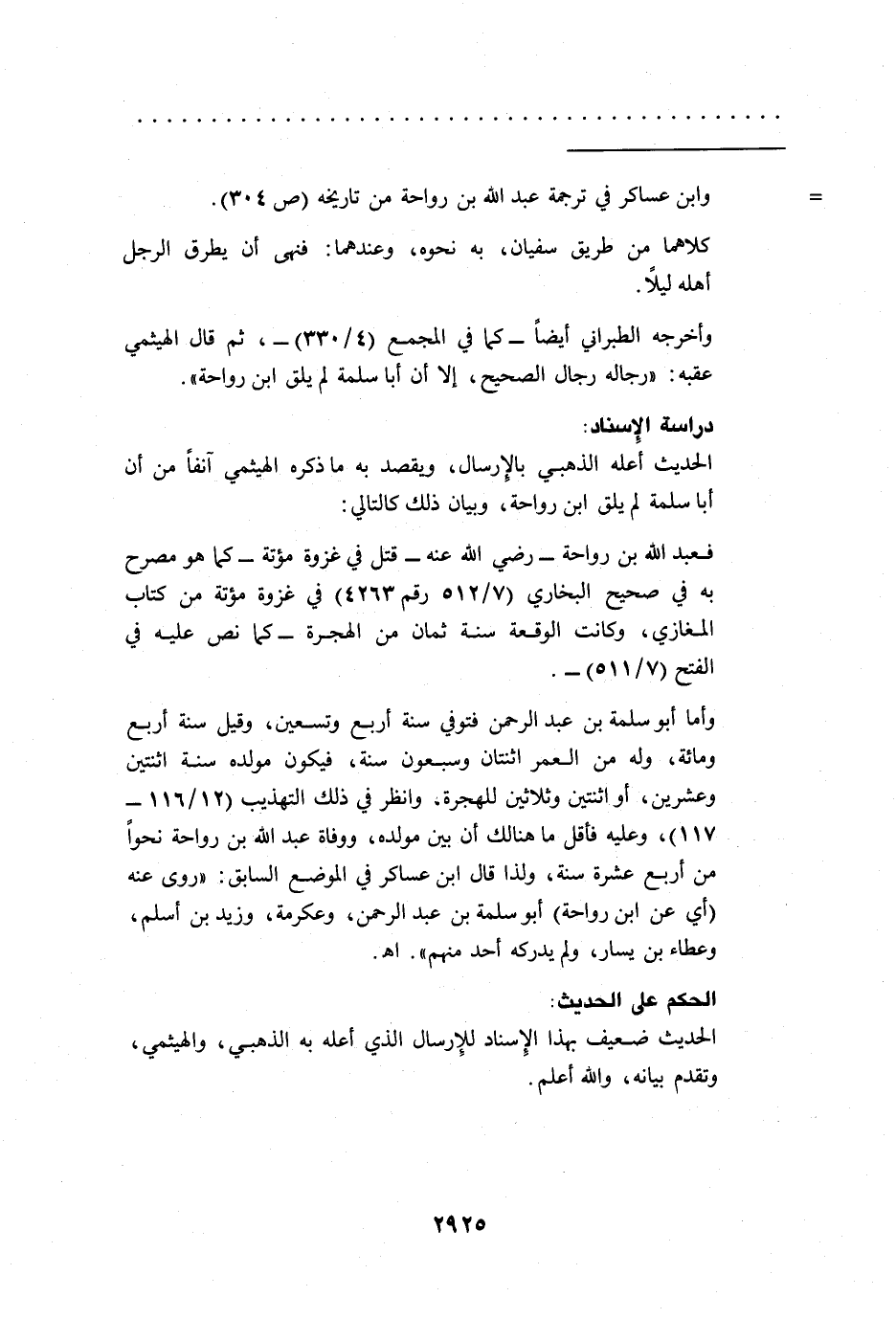 وأما أبو سلمة بن عبد الرحمن فتوفي سنة أربع وتسعين، وقيل سنة أربع ومائة، وله من العمر اثنتان وسبعون سنة، فيكون مولده سنة اثنتين وعشرين، أو اثنتين وثلاثين للهجرة، وانظر في ذلك التهذيب (12/ 116 - 117)، وعليه فأقل ما هنالك أن بين مولده، ووفاة عبد الله بن رواحة نحواً من أربع عشرة سنة، ولذا قال ابن عساكر في الموضع السابق: "روى عنه (أي عن ابن رواحة) أبو سلمة بن عبد الرحمن، وعكرمة، وزيد بن أسلم، وعطاء بن يسار، ولم يدركه أحد منهم". اهـ.