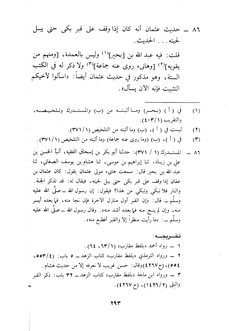 86 - المستدرك (1/ 371): حدثنا أبو بكر بن إسحاق الفقيه، أنبأ الحسن بن علي بن زياد، ثنا إبراهيم بن موسى، ثنا هشام بن يوسف الصغاني، ثنا عبد الله بن بحير قال: سمعت هانئ مولى عثمان يقول: كان عثمان بن عفان إذا وقف على قبر بكى حتى يبل لحيته، فيقال له: قد تذكر الجنة. والنار فلا تبكي وتبكي من هذا؟ فيقول: إن رسول الله -صلى الله عليه وسلم- قال: "إن القبر أول منازل الآخرة فإن نجا منه، فما بعده أيسر منه، وإن لم ينج منه فما بعده أشد منه". وقال رسول الله -صلى الله عليه وسلم-: "ما رأيت منظراً إلا والقبر أفظع منه".